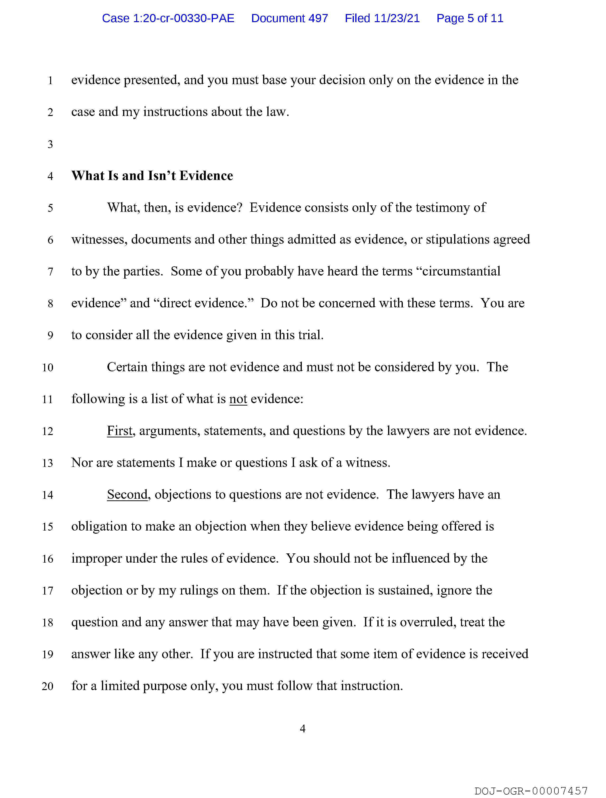 The image shows a page of a legal document, possibly a court transcript or a section from a case file. The text on the document is dense and discusses matters related to evidence and testimony in a legal context. It mentions concepts such as "relevance", "admissibility", and references to specific laws or regulations, like "Federal Rules of Evidence". There are no visible people or locations on this page, and it appears to be a formal, professional document intended for legal proceedings or review. The text is black on a white background, with the text size varying but generally small, indicative of official documents meant for careful reading.