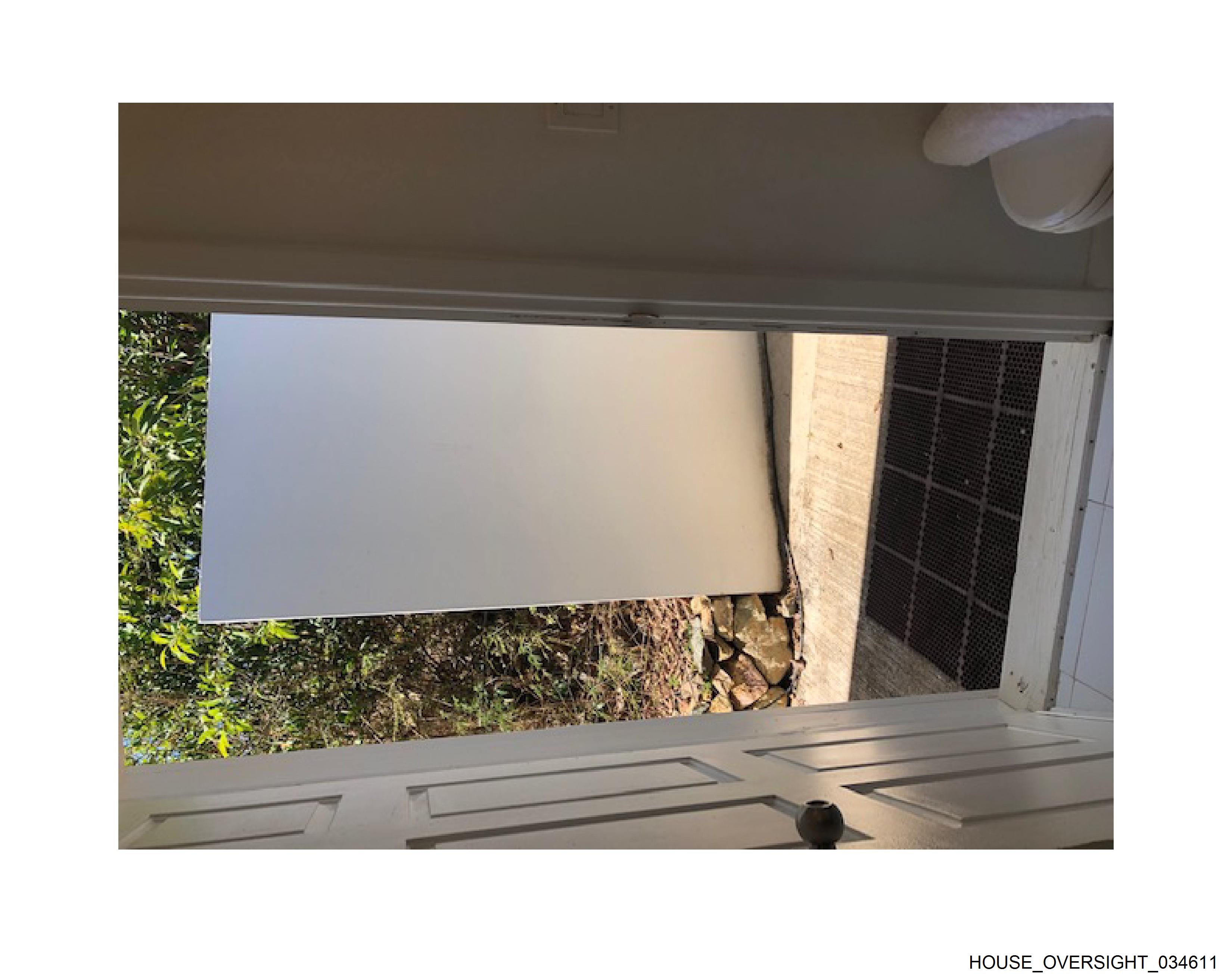 The image shows an interior view through a slightly open door, focusing on what appears to be the underside of a large sheet of paper or fabric that is partially draped over some furniture or objects below.