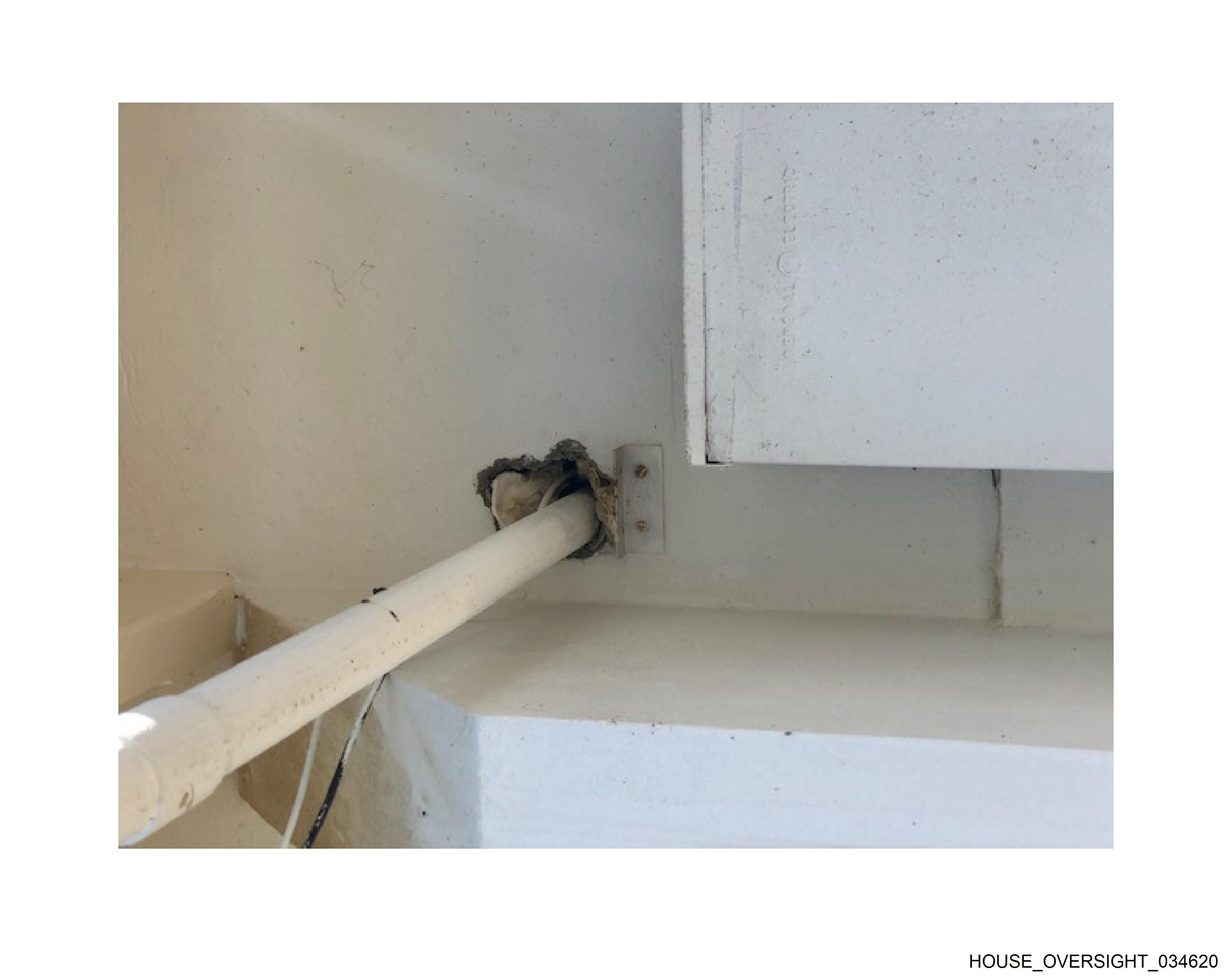 The image shows a close-up view of an indoor setting where a white wall meets a wooden cabinet at the corner. There's a noticeable hole near the baseboard between the two surfaces. A pipe is visible running along the floor next to the cabinet, and its color matches the cabinet wood, suggesting it might be part of the plumbing system for a sink or other fixture that's not visible in the photo. The image appears to have been taken with a smartphone based on the style of the camera flash reflection visible at the top edge.