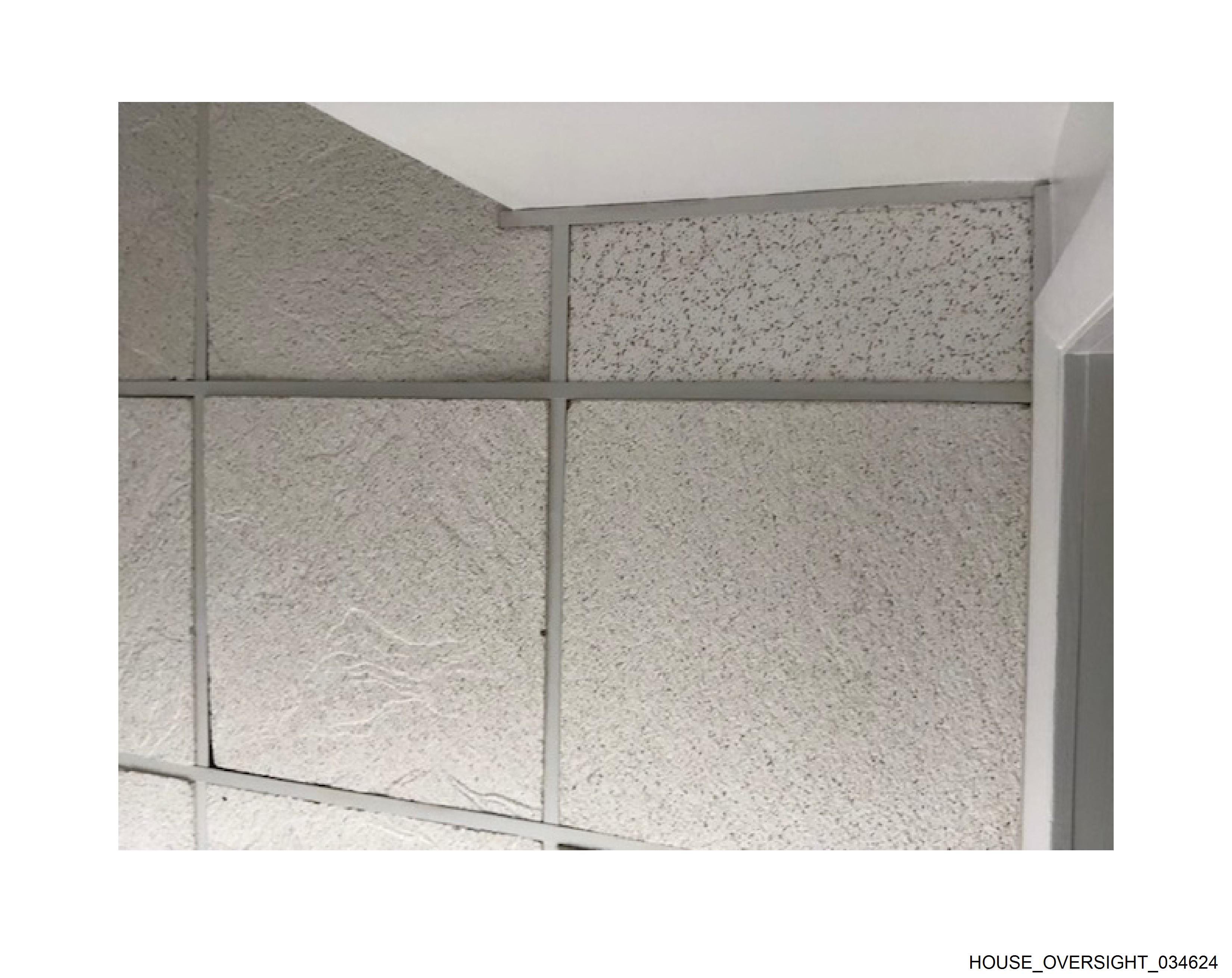 The image displays an interior view of a ceiling with gridded tiles commonly used for drop ceilings.