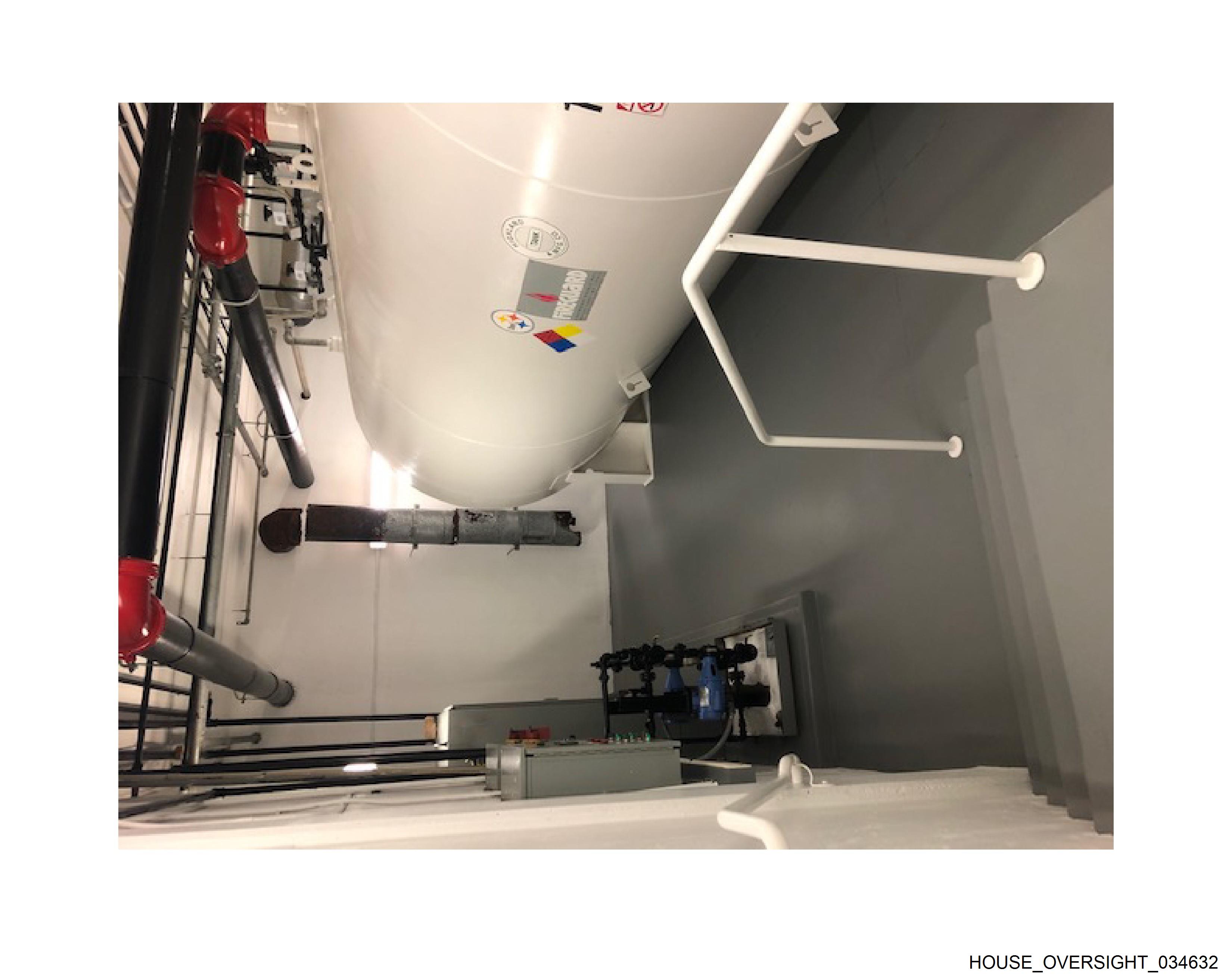 The image shows an interior view of a large industrial setting with various mechanical structures. In the foreground, there is a cylindrical object that appears to be a large pipe or tank, which has a white exterior and some colorful markings or stickers on its side. The room itself has a concrete floor and walls, with visible piping running along the top edge, suggesting it's part of an extensive plumbing system. In the background, there is another cylindrical object, similar to the one in the foreground, and a metal staircase leading upwards out of the frame. There is also what looks like a ventilation duct or fan on the left side. The lighting in the room appears artificial and diffused, contributing to an industrial atmosphere. No people are visible in the image.