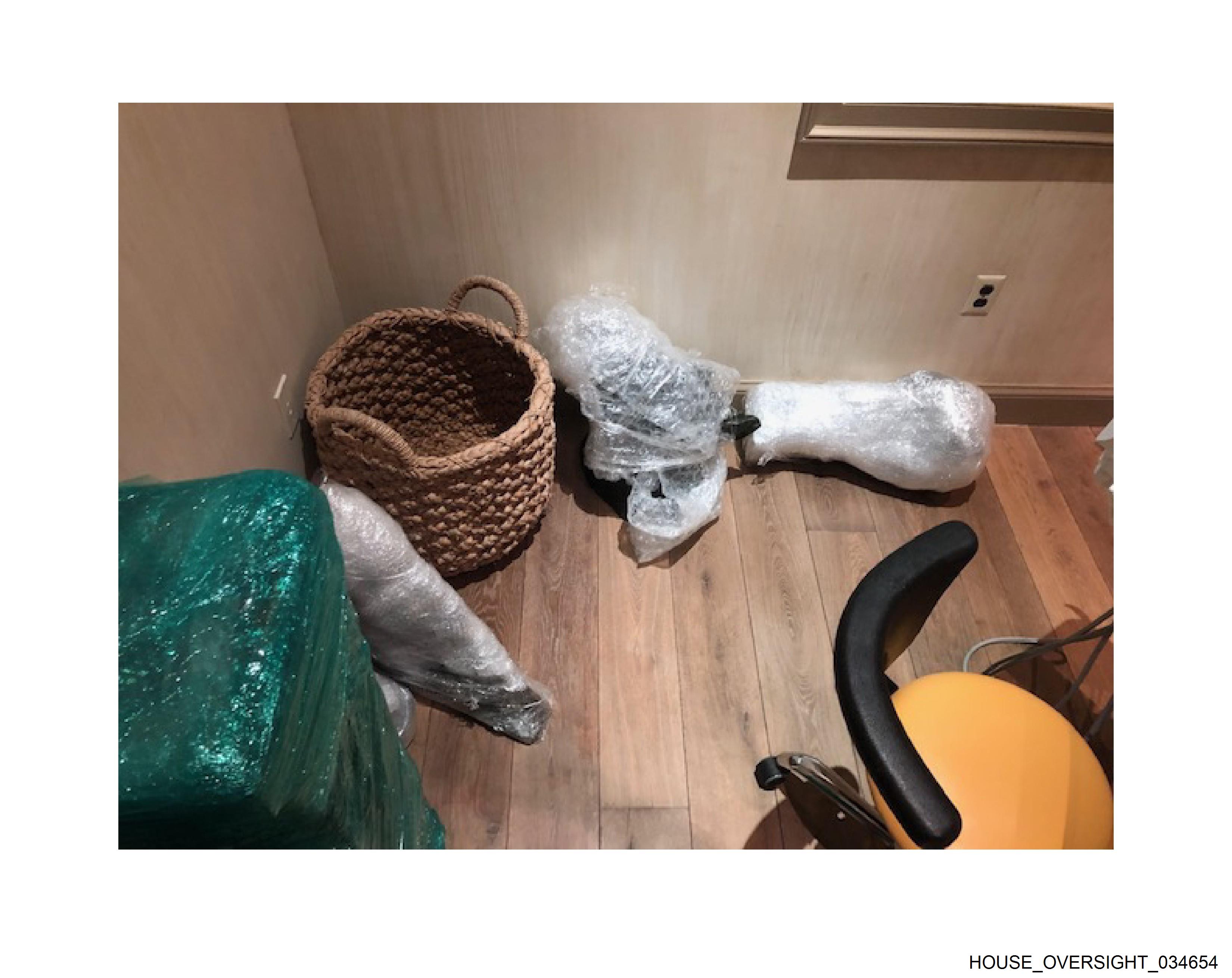 The image shows an indoor scene with a focus on two pieces of furniture: a wicker chair and a bicycle seat propped up against the wall. Both the chair and the bicycle seat are covered in what appears to be bubble wrap, suggesting they are being protected for transport or storage. To the left, there is a green fabric item that could possibly be clothing or another type of textile. There is also text present in the image, although it is partially obscured by an object; however, I can discern the words "HOUSE MOVING" which suggests that this might be part of a relocation process. The style of the photograph seems candid and appears to have been taken without staging or professional photography in mind.