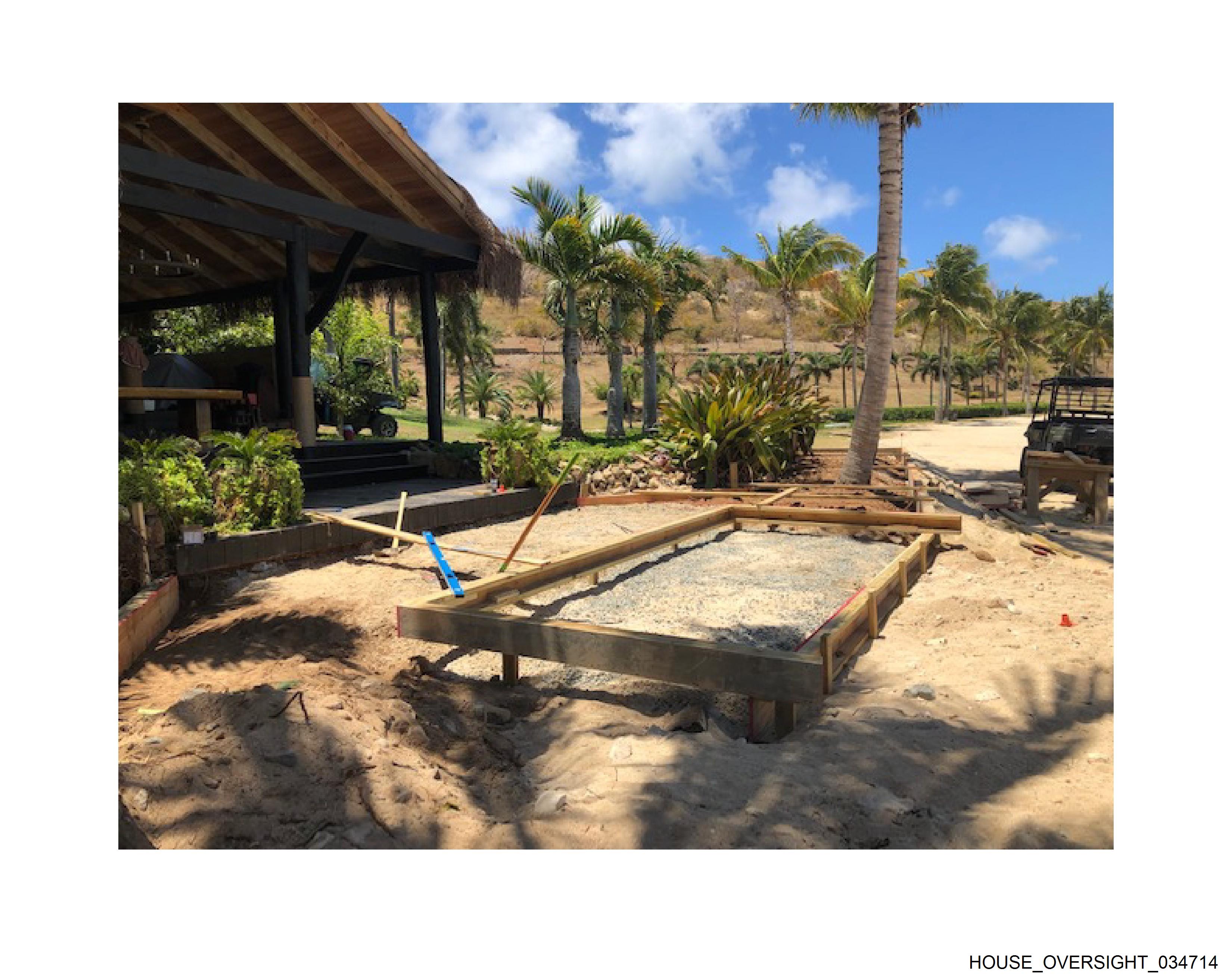 The image shows an outdoor setting with a focus on a piece of construction equipment, specifically what appears to be the base of a crane or similar large machinery. The structure is constructed from wooden planks and supports, with visible reinforcing bars embedded in concrete, indicating ongoing work such as foundation laying or repair. In the background, there's a clear sky above an area that looks like a beach or coastal landscape due to the presence of palm trees and sandy ground. There are no people visible in the image, and any text is not legible enough to describe confidently. The overall scene suggests construction work in progress in a tropical environment.