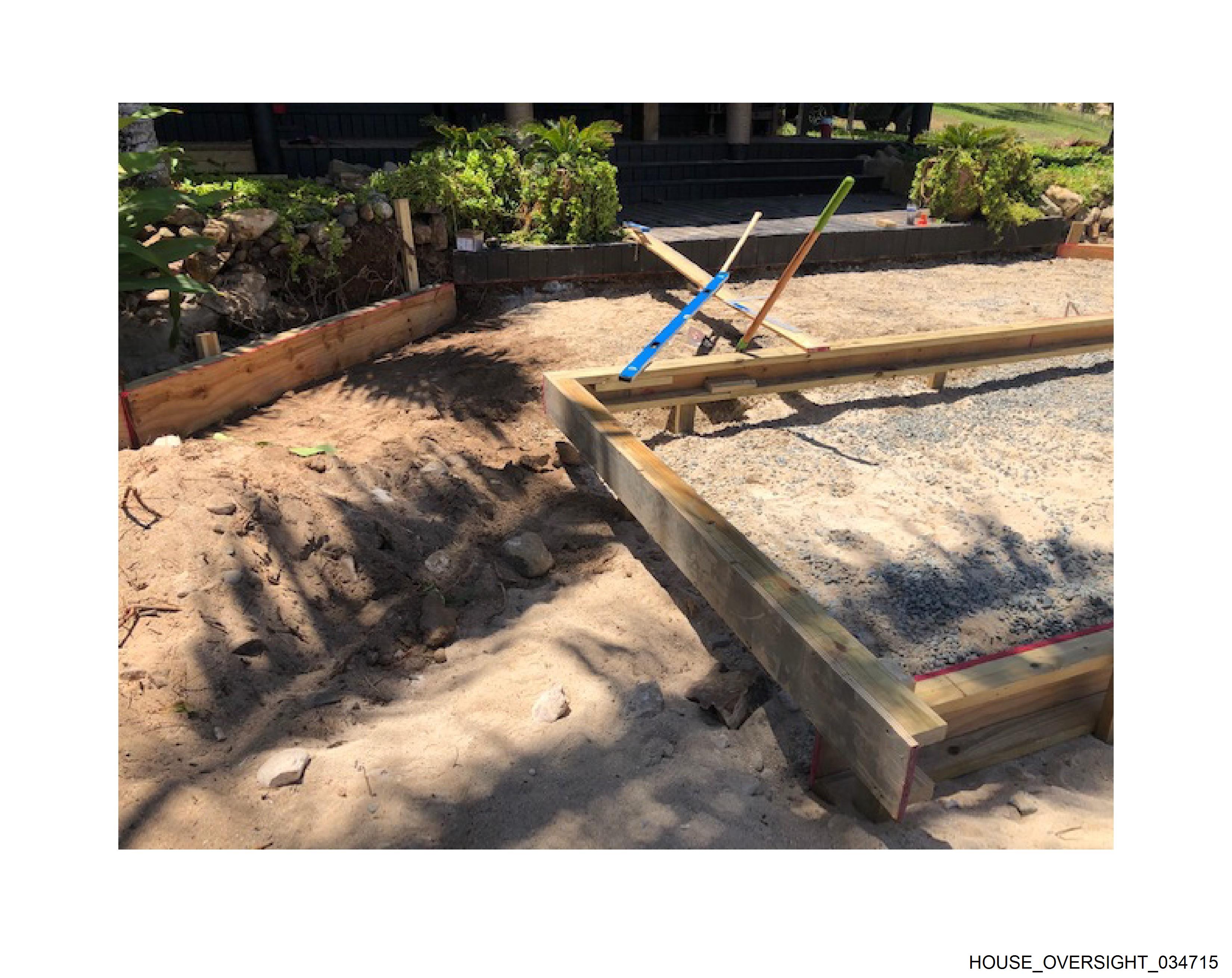 The image depicts a construction site under an overcast sky with patches of sunlight breaking through the clouds. In the foreground, there is a wooden frame structure partially filled with concrete, suggesting a freshly poured foundation or slab. A piece of blue construction equipment, possibly a wheelbarrow or hopper, is tipped towards the concrete, likely used to pour the material. The ground around the site is covered in loose soil and scattered debris. There are no visible texts, people, or locations that can be confidently identified from this image.
