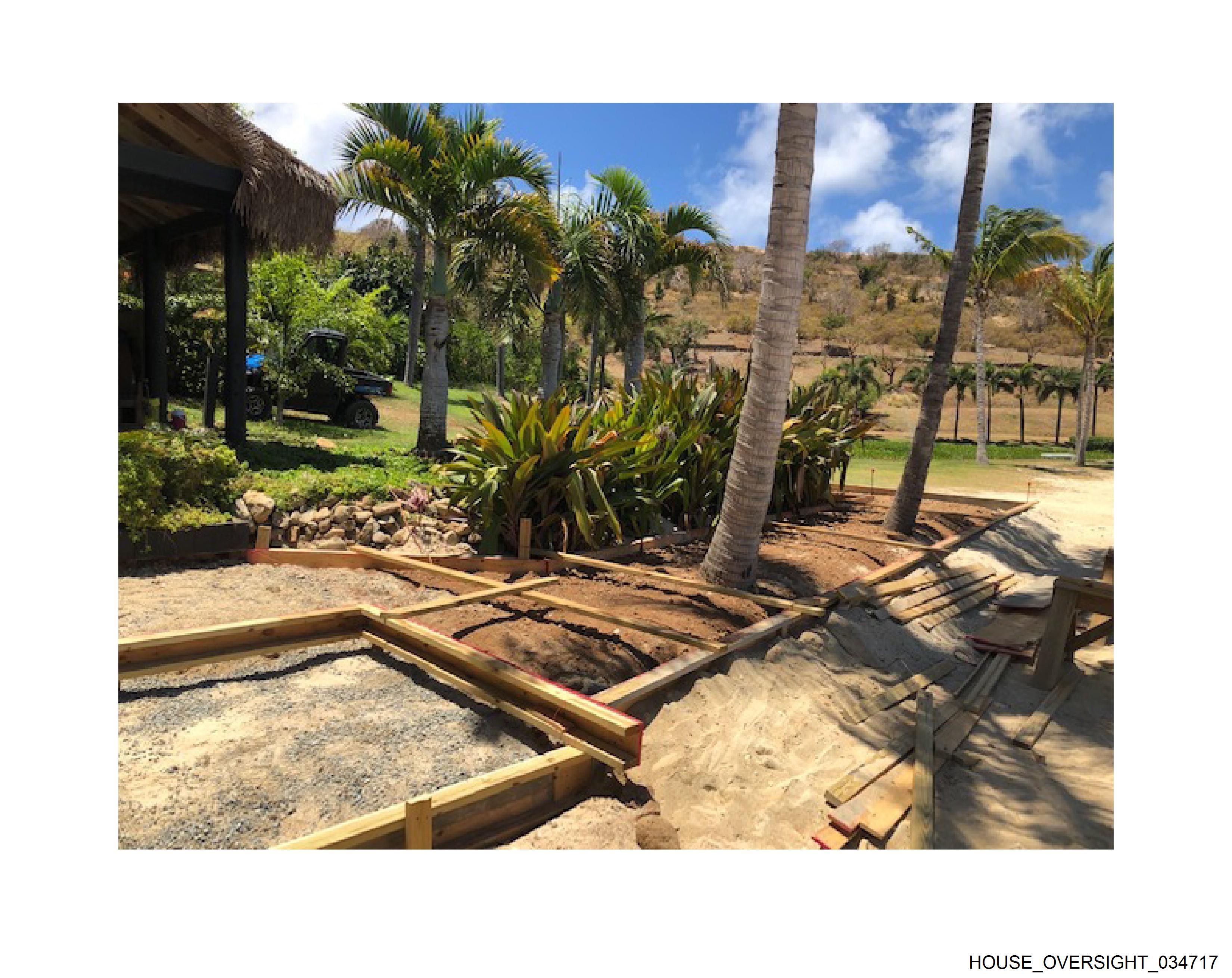 The image depicts a tropical garden scene during what appears to be either dawn or dusk, given the soft lighting. In the foreground, there's an area under construction with wooden scaffolding and some exposed soil. The middle ground features various types of plants and trees, including palm trees that are native to tropical climates. The background reveals a clear blue sky meeting the horizon line at the top edge of the photo. There is no visible text or people in this image. The style of the photograph seems candid and possibly taken by someone documenting their surroundings or a project they're involved in, such as a house renovation given the visible construction work.
