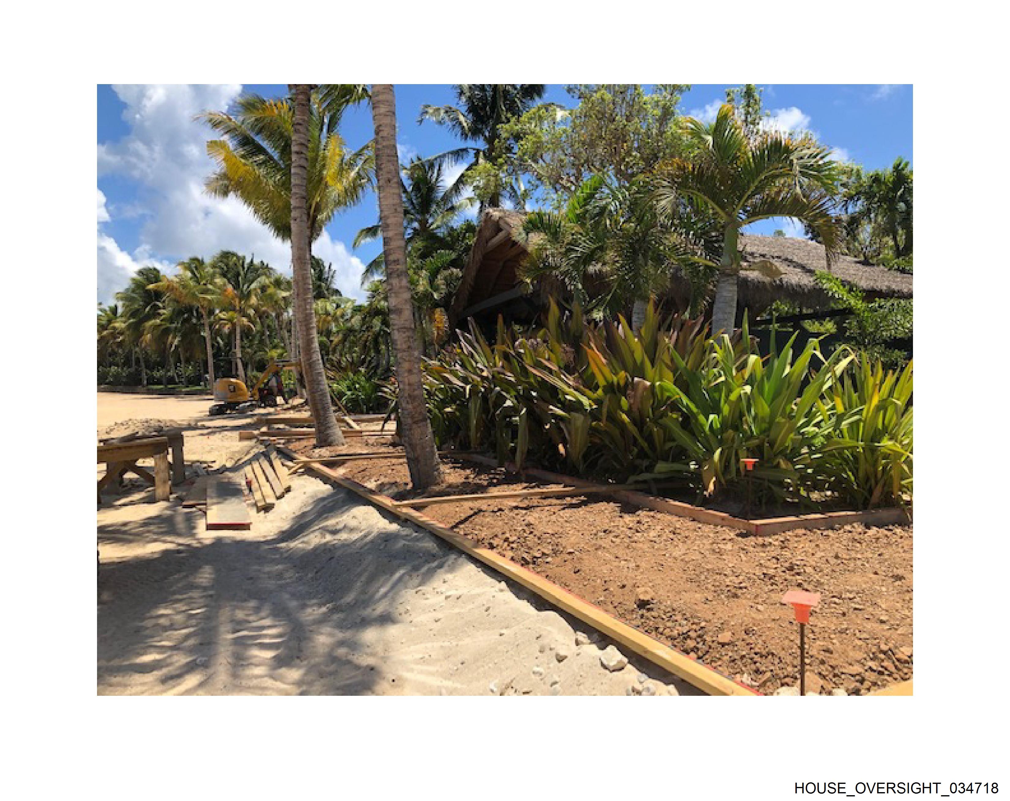 The image shows a tropical outdoor setting during the daytime under a clear sky with some clouds. There are lush green plants and palm trees that indicate a warm climate. A wooden building with thatched roofs is visible in the background, suggesting a traditional or rustic architecture common to island resorts or beachfront establishments. In front of the building, there's a pathway made of gravel or similar material. On the right side of the image, there's a section where the ground has been dug up, with bare earth exposed and some orange markers, indicating ongoing construction or landscaping work in that area. There is no text present in the image to provide additional context or information about the location or activity.
