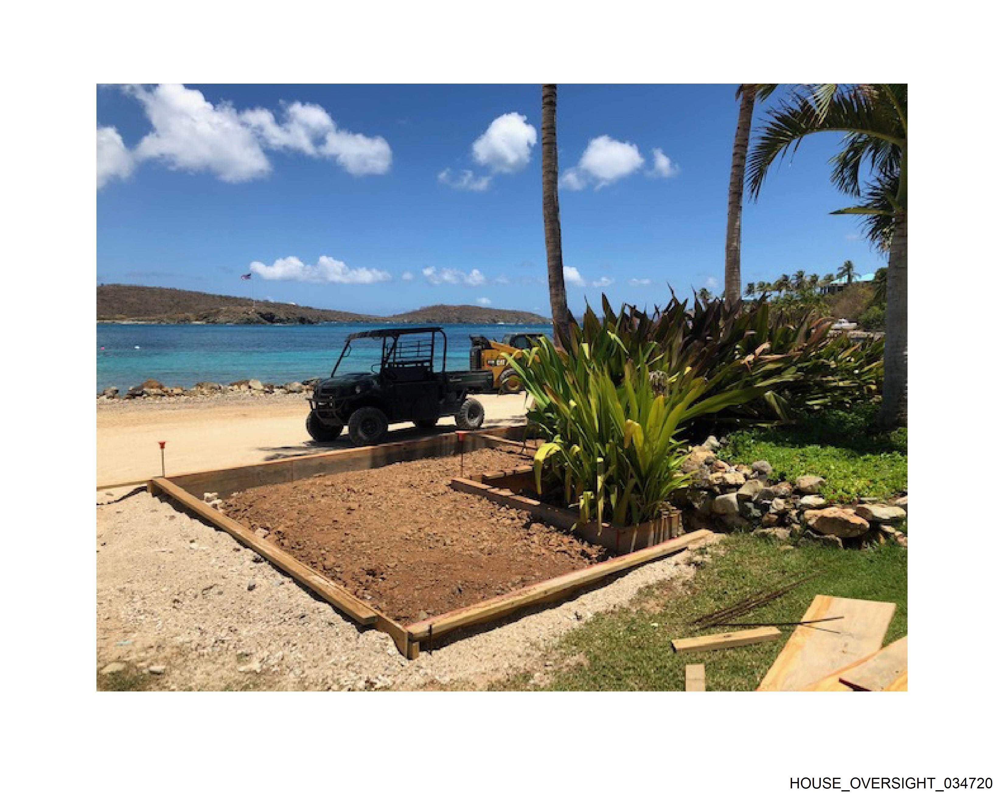 The image shows a tropical setting with a body of blue water that could be an ocean or sea. There is a sandy area where a small structure appears to be under construction or renovation; the ground here looks disturbed with exposed earth and a wooden frame, suggesting some work is being done on this space. To the right, there's a green palm tree providing a tropical ambiance. In the background, on what seems like a dock or pier, there is a parked vehicle, possibly a utility truck, indicating human activity in the area. The sky is clear with a few clouds, and the overall scene suggests a sunny day. There are no people visible in the photo.