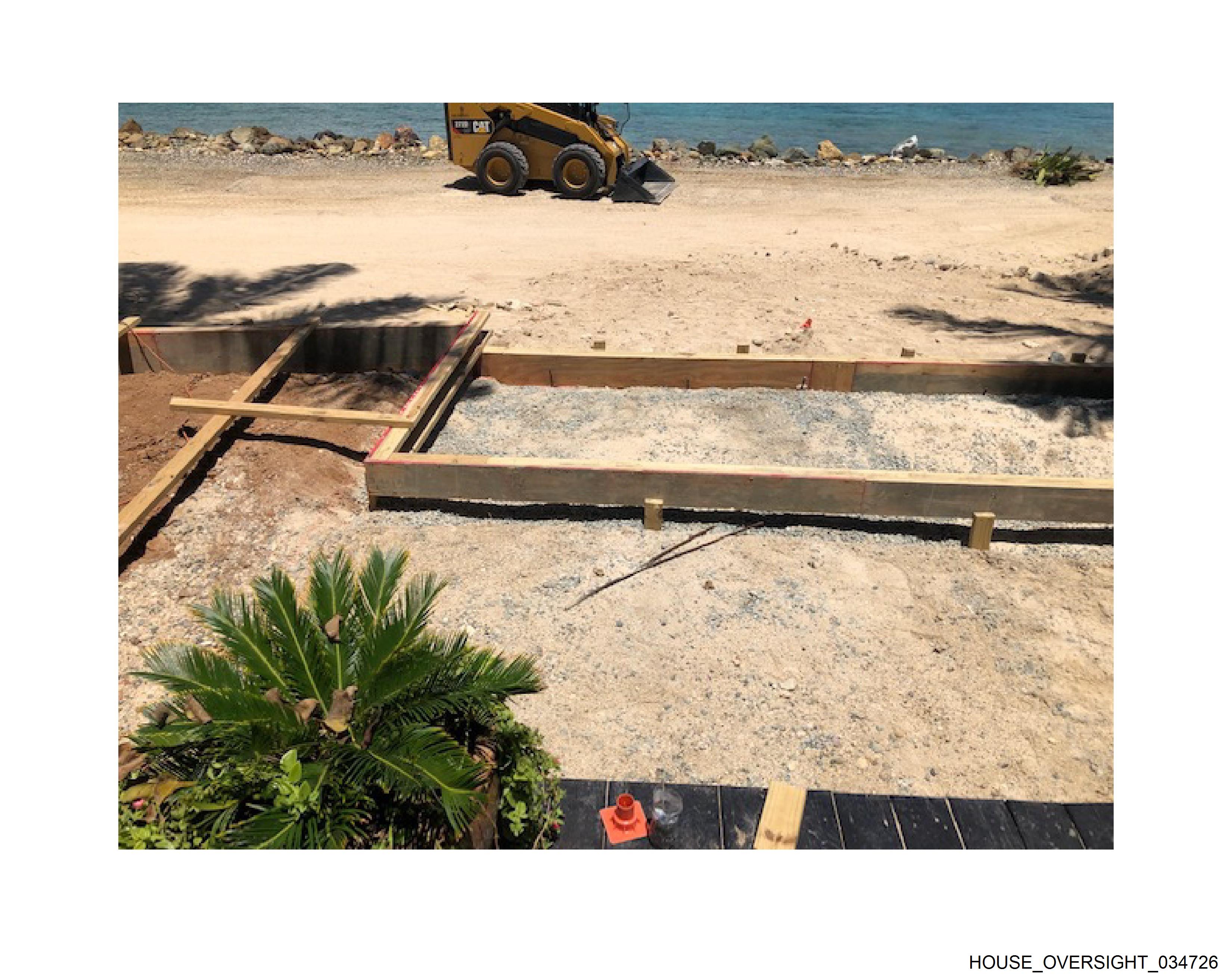 The image depicts a construction site with an unfinished foundation. There are wooden studs and joists exposed above the concrete slab, which suggests that a house is being built or renovated. The site has a temporary appearance, with various materials scattered around, such as plywood sheets and what appears to be plumbing pipes. In the background, there's a glimpse of the ocean, indicating that the location might be near a coastal area. The sky is overcast, and there are no people visible in the frame.