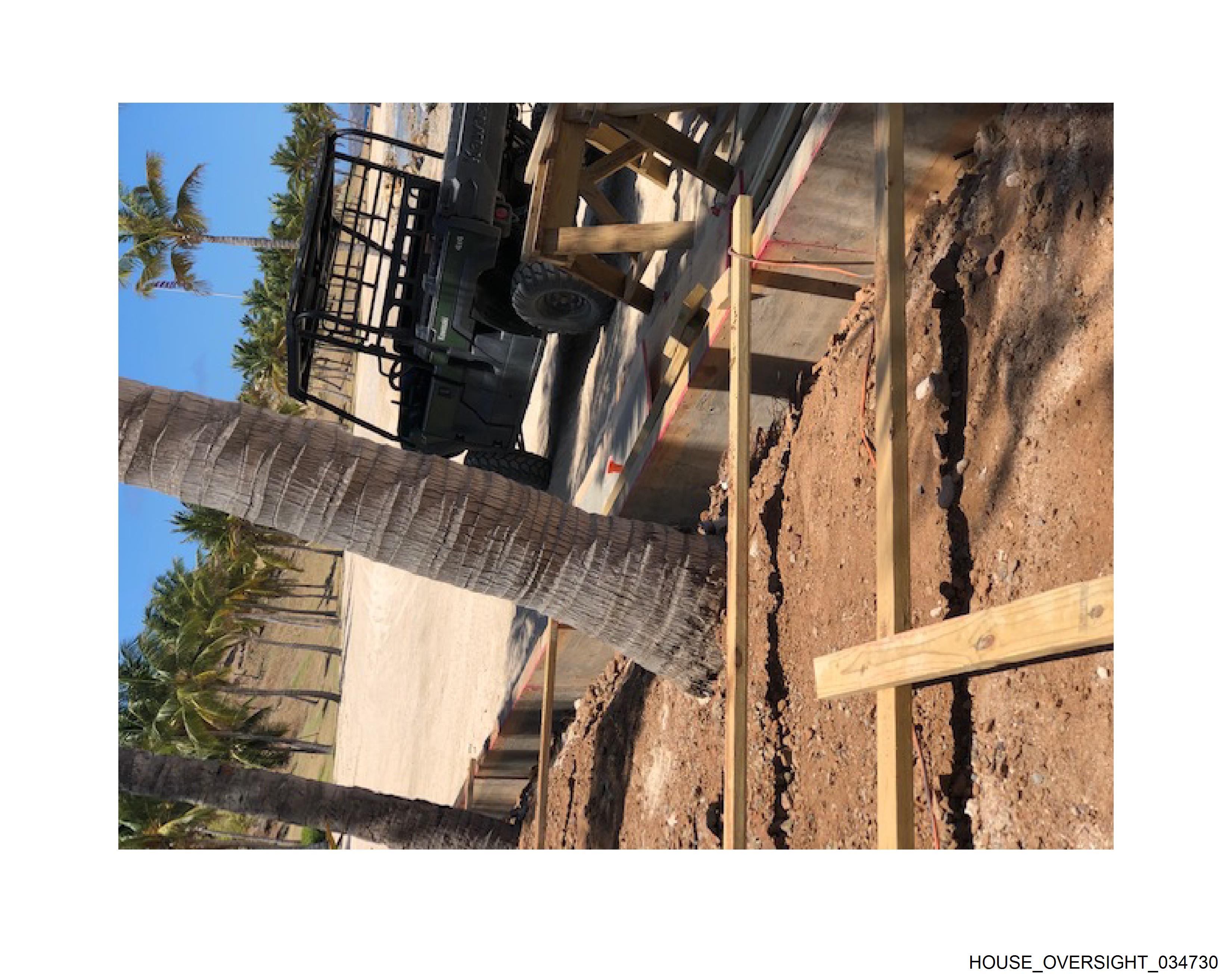 The image shows a construction site with wooden frames and beams that have been partially erected around a central pit. The ground is dug up, revealing earthwork typical of the early stages of building construction. In the foreground, there are palm trees, suggesting a tropical or subtropical location. On the right side of the frame, there's a watermark text that reads "House Overhaul 2016," indicating that this image might be related to home renovation works from that year. The sky is clear and blue, implying good weather conditions for construction activities.