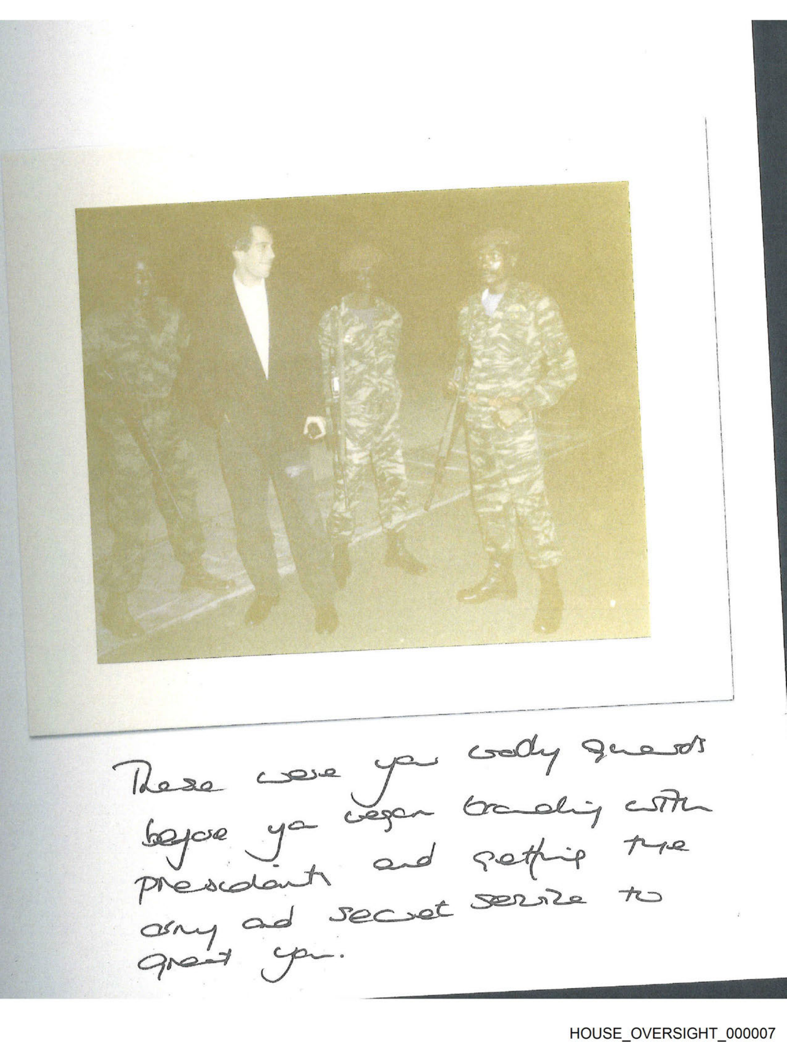 The image is a photograph with an overlaid handwritten note at the bottom. In the photograph, there are four individuals standing close to each other on what appears to be a street at nighttime. The person in the center is wearing civilian clothing, while the three others are dressed in camouflage military uniforms and helmets, suggesting they might be soldiers. The setting looks like an urban environment with a dark background that does not provide clear details of the surroundings. The handwritten note on the bottom reads: "Here you can see your dad in the back looking pretty cool with his big head." This text is written in ink and seems to be addressing someone regarding their father's appearance in this image. The style of the image suggests it might have been taken from a book or printed material, as indicated by the visible edge on the left side where the photograph meets the page.