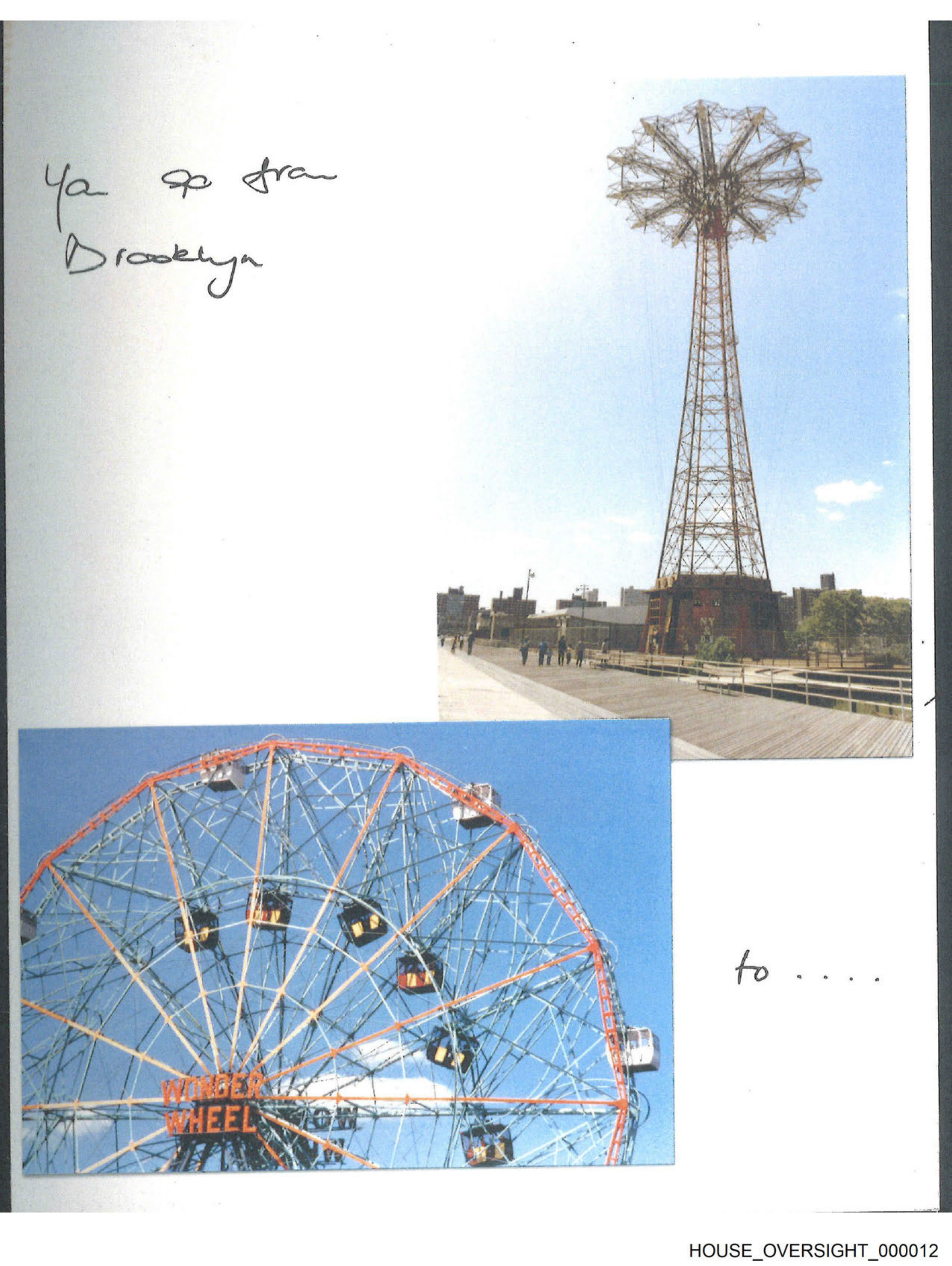 The image features two photographs of ferris wheels. The first photograph shows a ferris wheel with the word "Coney Island" written on it. In the background, there is a clear blue sky and some structures that are not clearly defined due to the focus being on the ferris wheel. In the second photograph, which is smaller and placed below the first, there is another ferris wheel with the word "Coney Island" written in the middle of it. This time, there's a different view of the structure, showing more detail around the base and a clearer indication that this wheel is located within an amusement park or fair setting. The sky is also blue but appears slightly hazy compared to the first photo. There are no visible people in either photograph, and all texts indicate that these images were taken at Coney Island, which is a well-known location for its historic roller coasters and amusement parks.