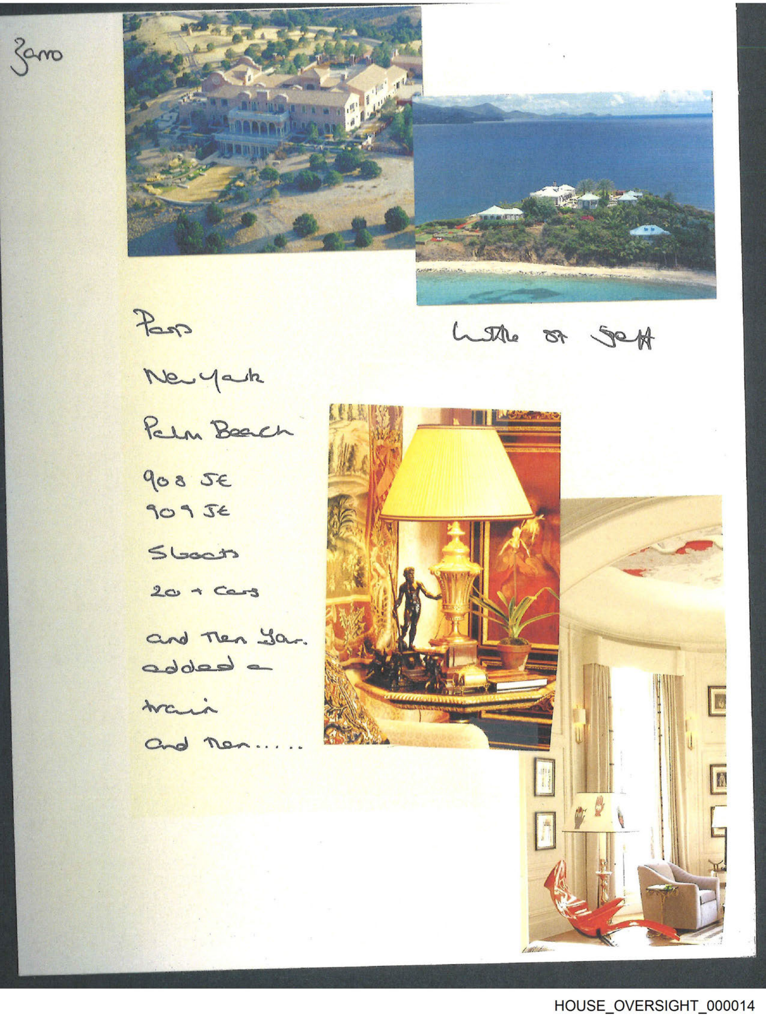 The image you've provided appears to be a scrapbook page featuring three photographs and some handwritten text. The central photograph shows an upscale interior with ornate decorations, possibly depicting a luxurious room in a hotel or mansion. To the left, there is another photograph that seems to capture a picturesque view of a coastal area, suggesting it could be from a location near water, such as a beach resort. On the right, the third photo showcases a spacious and well-furnished room with high ceilings and large windows, which might be part of an upscale property like a hotel suite or residence. The handwritten text includes names, prices, and notes about dates and events, but it is not fully legible from this image.
