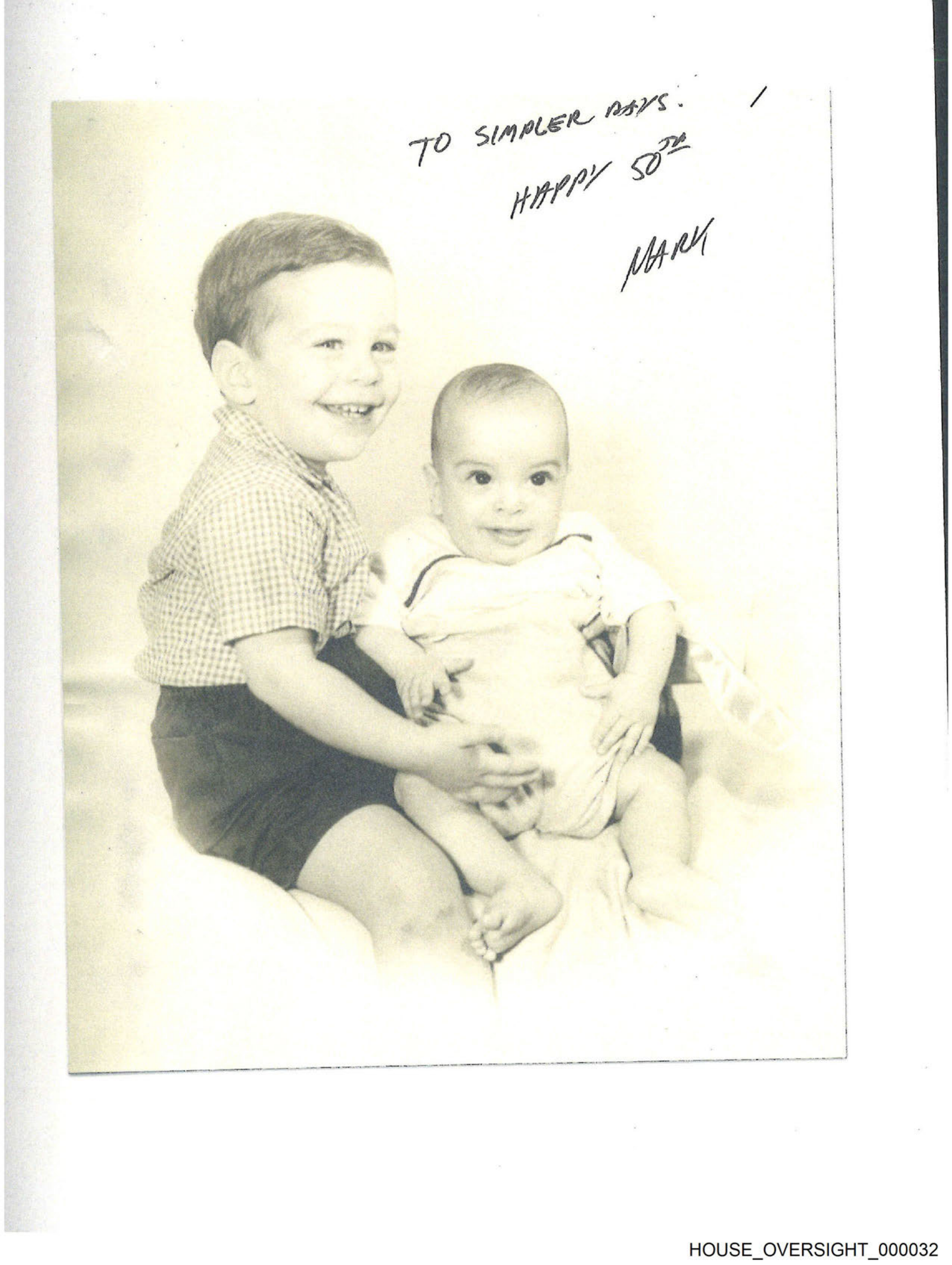 The image is a black and white photograph featuring two young boys. The boy on the left is sitting behind the other, whose back is turned to him, creating an impression of one child holding the other around the waist. They are both smiling at the camera. There is visible text that appears to be written in a script style, which reads "To Stephen Happy Birthday" followed by what seems to be a signature or name, suggesting that this photo might have been sent as a birthday greeting to someone named Stephen. The photograph has aged and shows signs of wear, indicating it could be quite old or well-loved.