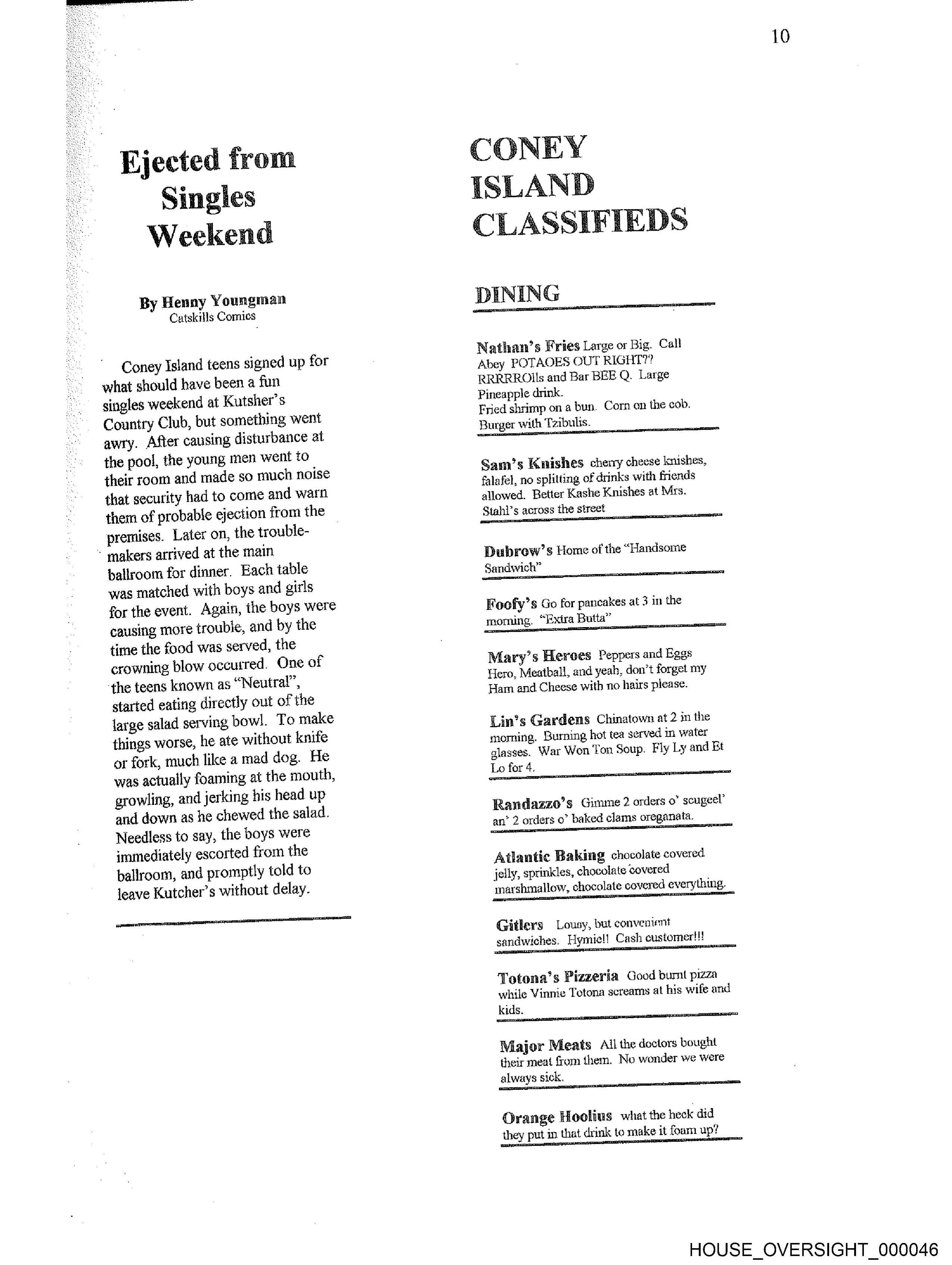 The image is a photograph of a printed document with two columns. On the left column, there's text that appears to be an article or section heading. The right column lists items under the header "DINING IN CONEY ISLAND" which includes various food options such as "Egg Cream," "Fresh Squeezed Lemonade," and "Nathan's Hot Dog." The text is in black ink on a white background. There are no people or locations depicted within this image; it focuses solely on the printed content of the document.