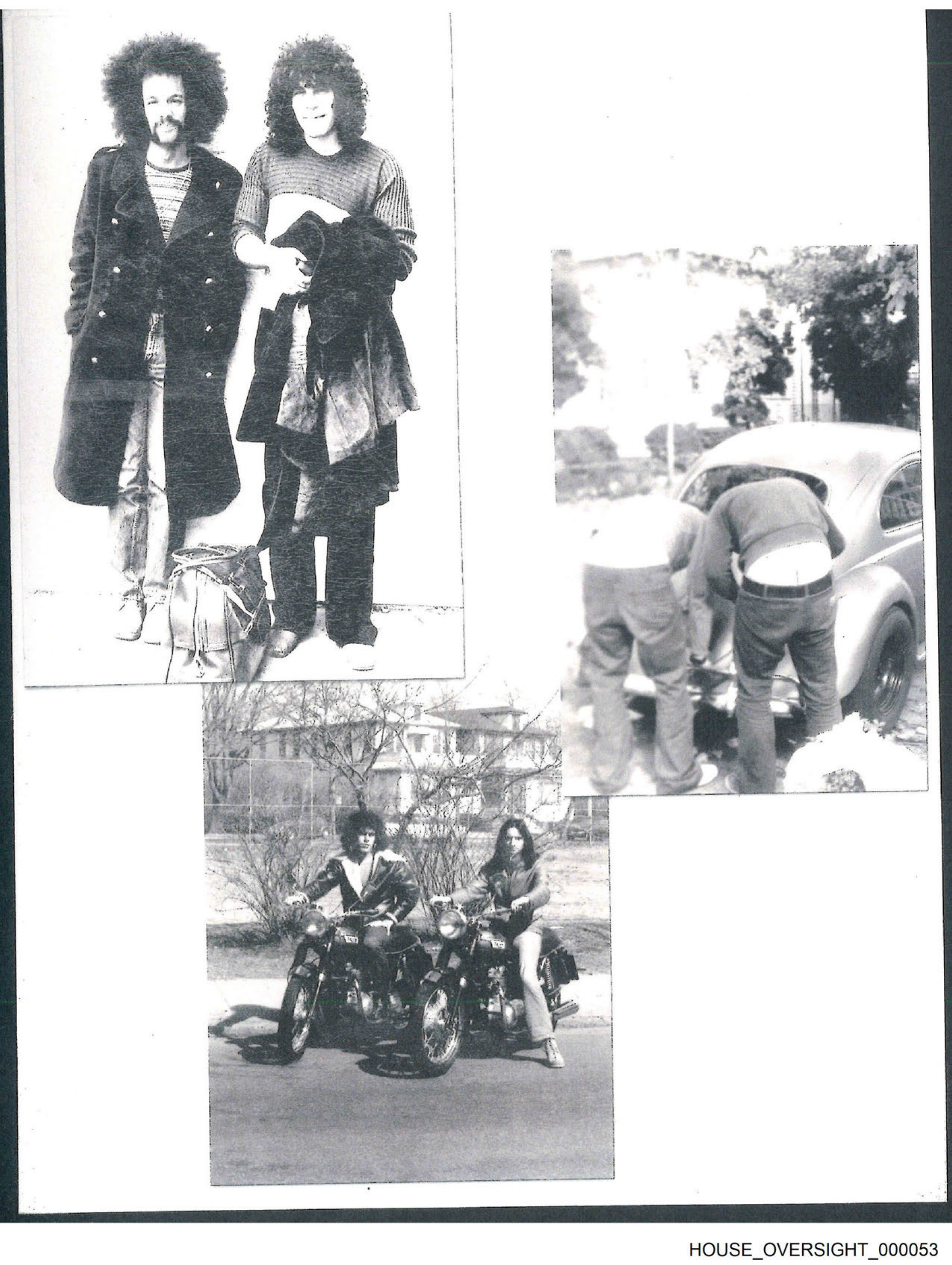 The image is a collage of three photos, each depicting different scenes from the past. The top photo shows two individuals posing together for a portrait; both are wearing long coats and one appears to have longer hair. In the center photo, another pair is seen standing near an old car; they too are dressed in styles indicative of a bygone era, with patterned shirts and wide trousers. The bottom photo captures three people on what looks like a motorbike ride; the driver wears a helmet, while one passenger has their arms around the other's waist for support. All photos have a grainy quality to them, suggesting they were taken some time ago.