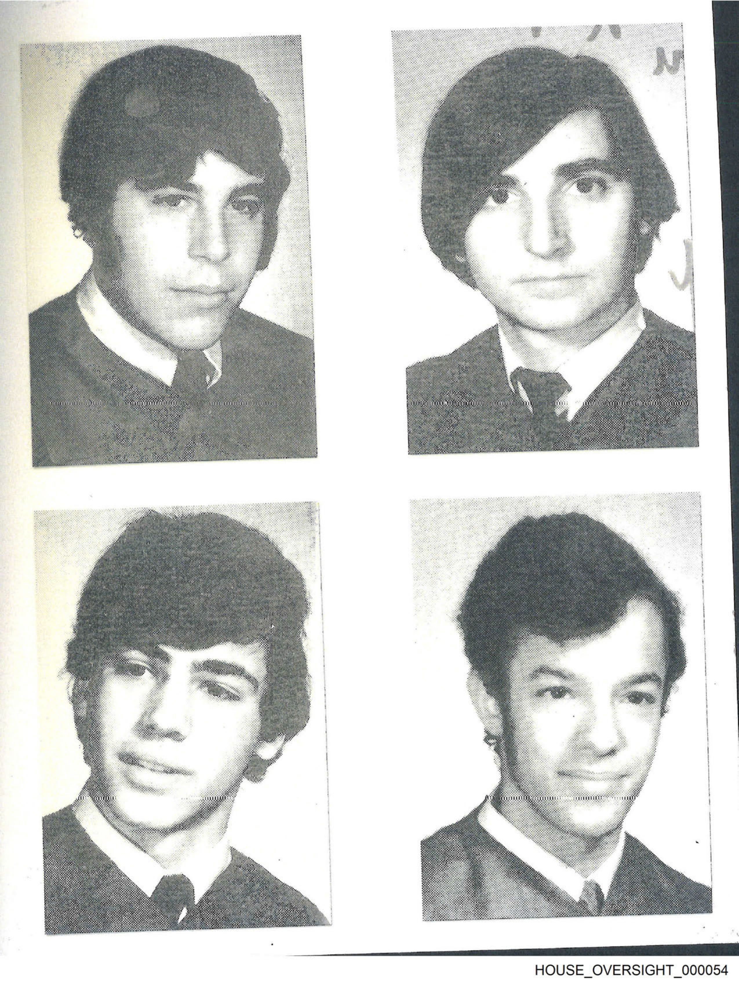 The image is a collage of four photographs arranged vertically. Each photograph appears to be an old ID or school portrait with a white border around the image. 1. The top left photo shows a young male with short hair and glasses, wearing what looks like a uniform consisting of a shirt and tie. He has a serious expression on his face. 2. To the right, there is another portrait of a young male who also has short hair but appears to be without eyeglasses. He wears a similar outfit as seen in the first photograph. His facial expression seems neutral or slightly puzzled. 3. The third photo captures a young man with shoulder-length curly hair. His attire includes what might be part of a school uniform, although it is not clearly visible. He has a slight smile and appears to be looking directly at the camera. 4. The bottom right image features an individual who appears older than the others depicted in the collage. This person also seems to be wearing a uniform or formal clothing with a shirt and tie. His expression is neutral, and he looks straight ahead at the camera. The style of the photographs suggests they were taken several decades ago, given the quality and style of the imagery.