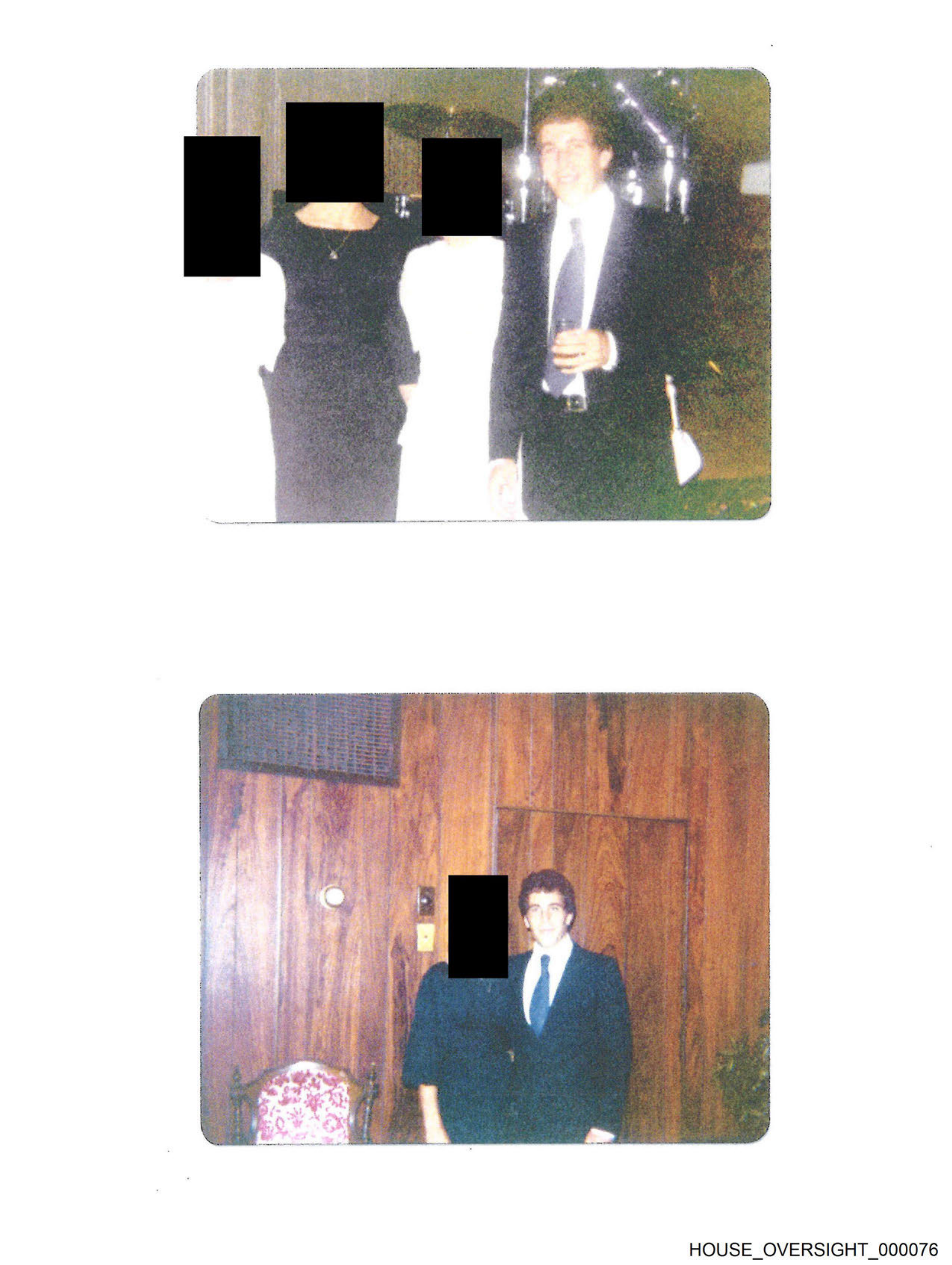 The image shows two separate photographs placed side by side. In the top photograph, there are three individuals: a man and a woman standing close to each other and another person whose face is obscured. The man is wearing a tie and appears to be in semi-formal attire, while the woman is dressed in a dark outfit with what looks like a cardigan or jacket. They seem to be posing for the photo. The bottom photograph features two people as well: a man in the foreground looking directly at the camera, wearing a suit and tie. He has dark hair and is smiling slightly. To his side, partially cut off by the frame of the image, is another person whose face is obscured. The setting appears to be indoors, possibly a room with wooden paneling or a wall made of wood planks. In both photographs, there are no visible texts that provide additional context or information about the scene or the individuals. The style of the images suggests they might be from a personal photo album or collection due to their informal nature and lack of professional quality.