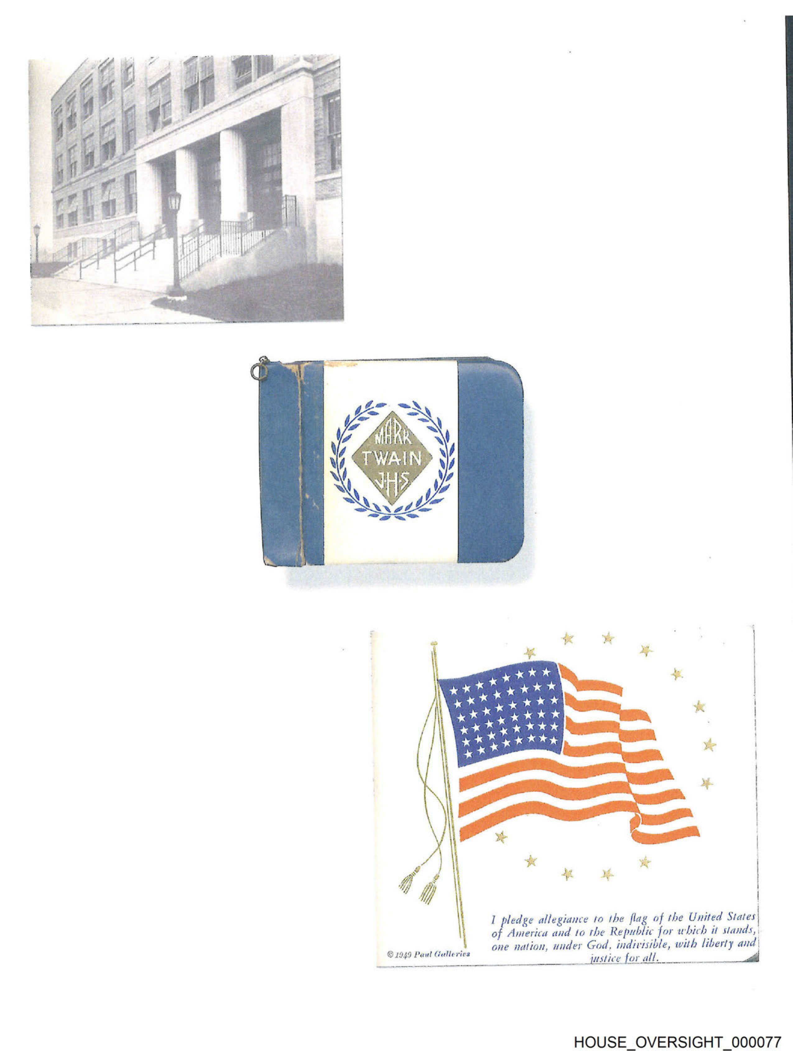 The image appears to be a digital collage with several smaller images arranged together. On the top left is a black and white photograph of an exterior building facade that resembles an old schoolhouse or institutional building. Next to it, on the right, there's a small blue passport-like item with what seems to be embossed text and a emblem or logo at its center. Below this, to the left, is another black and white photograph showing an American flag waving in motion. The bottom right of the collage features an image of an envelope with a stamp bearing a colorful depiction of the American flag, also with stars appearing to move as if they are part of the wind's movement. There are no visible texts within these images that provide additional context or information about their content.