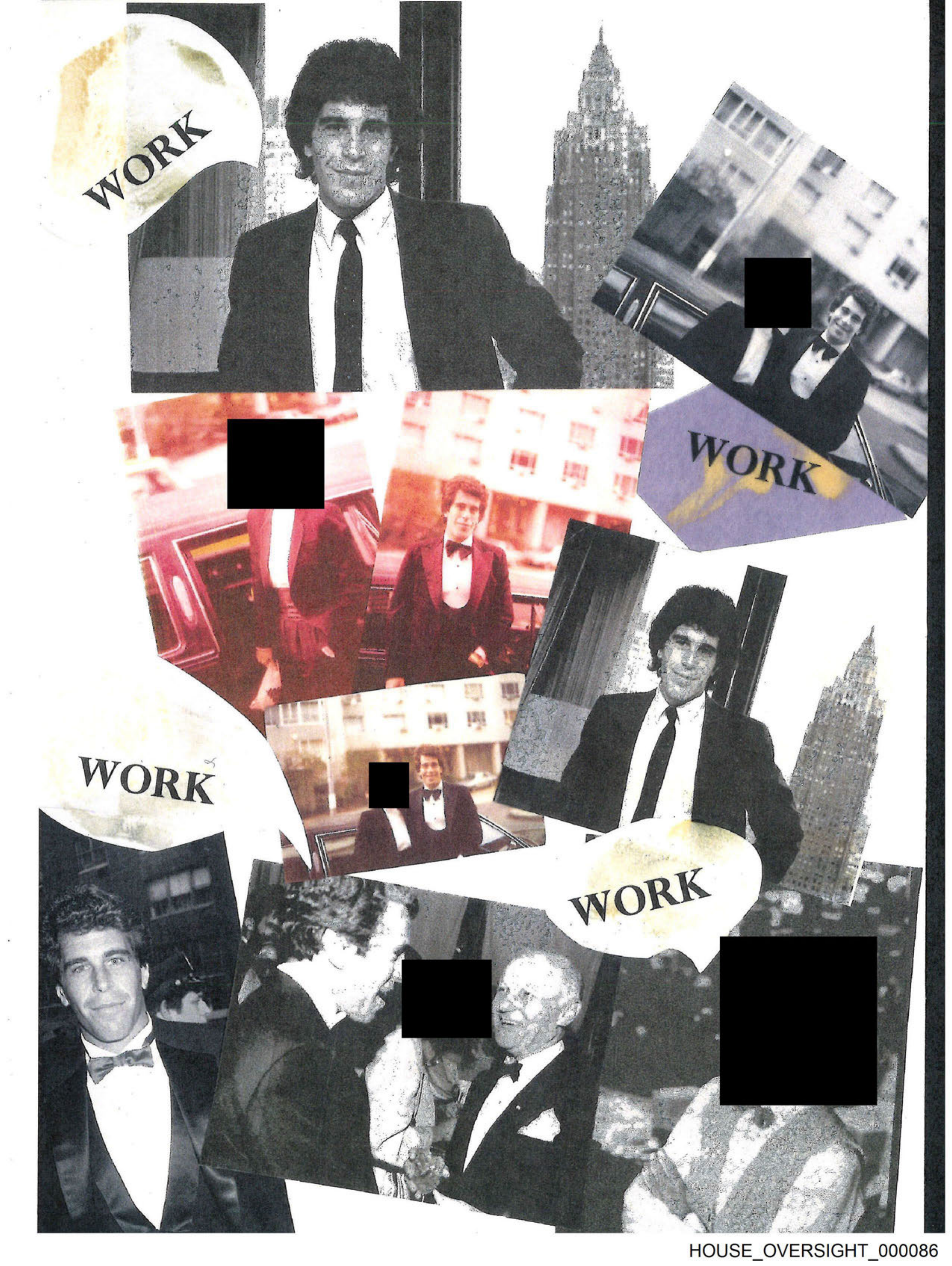 The image is a collage of several photographs featuring the same man dressed in formal attire, including suits and ties. The top left photo shows him standing alone, while subsequent photos depict him with other individuals at various events, possibly parties or gatherings. Some photos are overlaid with text, specifically with the word "WORK" repeated, suggesting that the collage might be related to a work theme, such as career highlights or professional accomplishments. The background behind the photos is not clear but seems to include additional text and images, indicating that this collage may have been part of a larger presentation or publication.