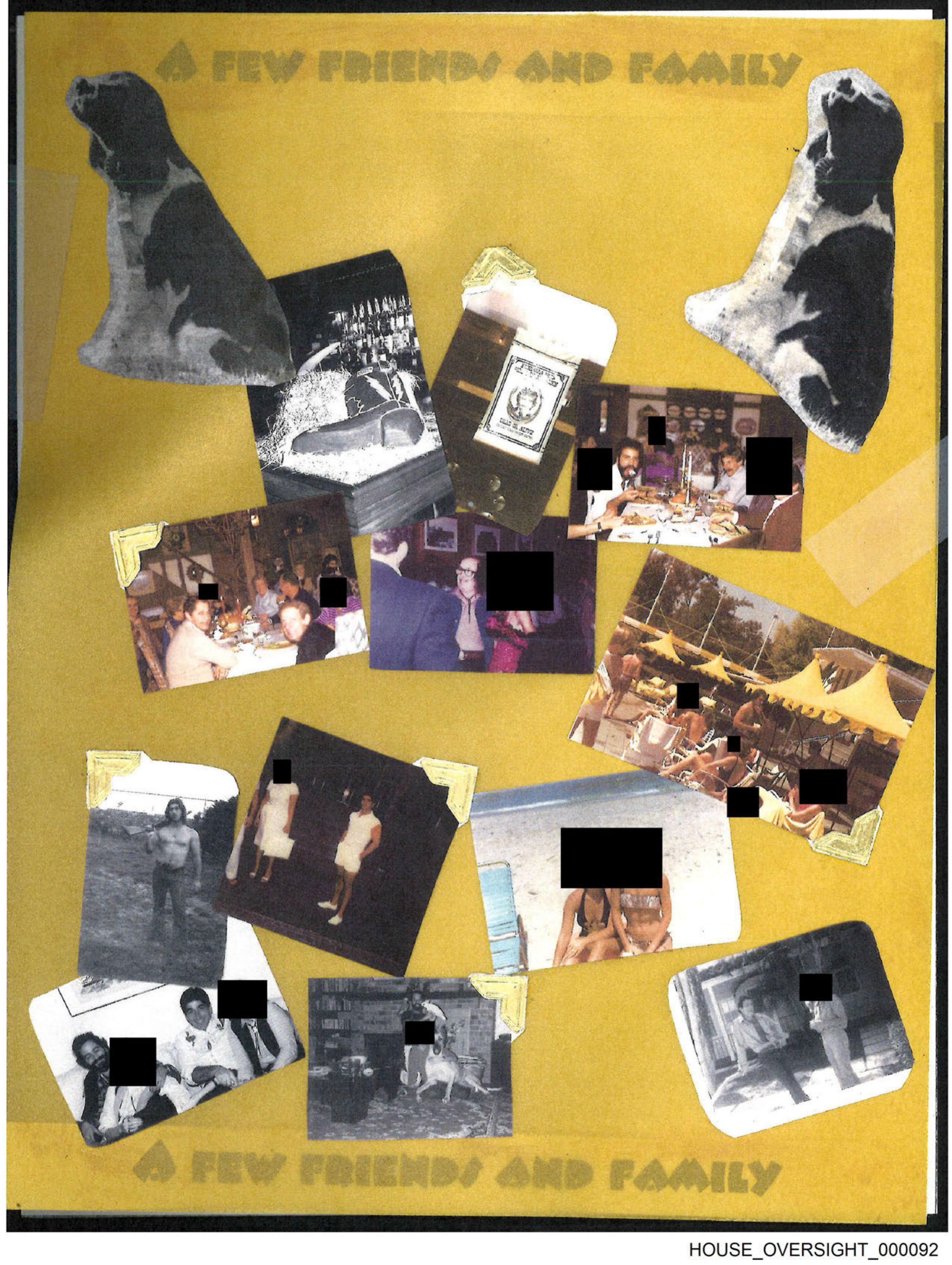 The image shows a collection of photographs and printed images on a yellow background with a border that resembles cut paper edges.