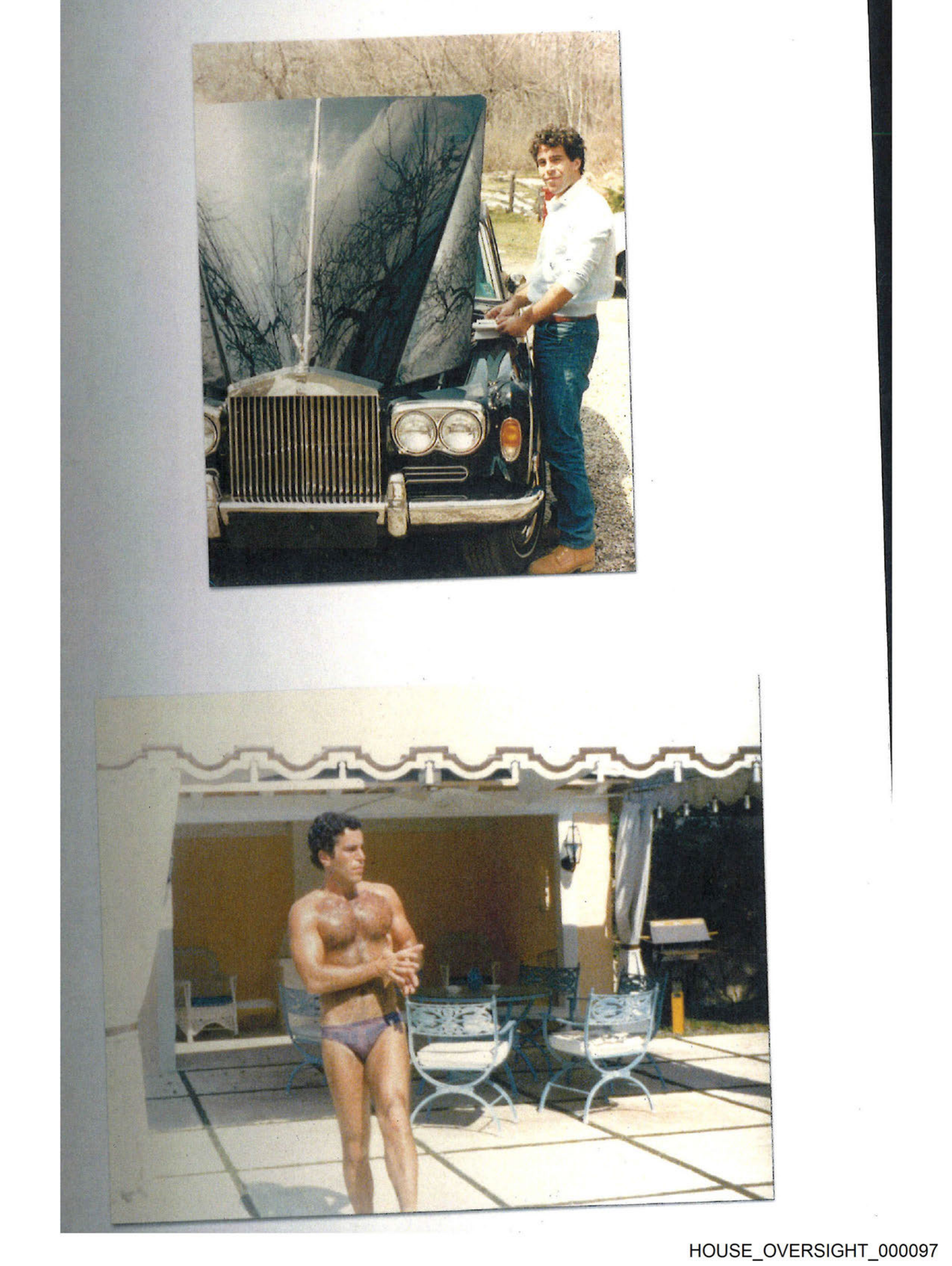 The image presents a split comparison of two photographs side by side. On the left photo, a man is seen standing next to an older model car, possibly from the 1960s given its design and color, which resembles the iconic Mustang. The car's body is painted in shades of gold and white. The right photo features the same man, now older and with a beard, posing shirtless outdoors. He is standing in front of a building that has an awning with intricate designs on it. A palm tree can be seen behind him, suggesting a warm climate or location like Florida. There are no visible texts within these photographs.