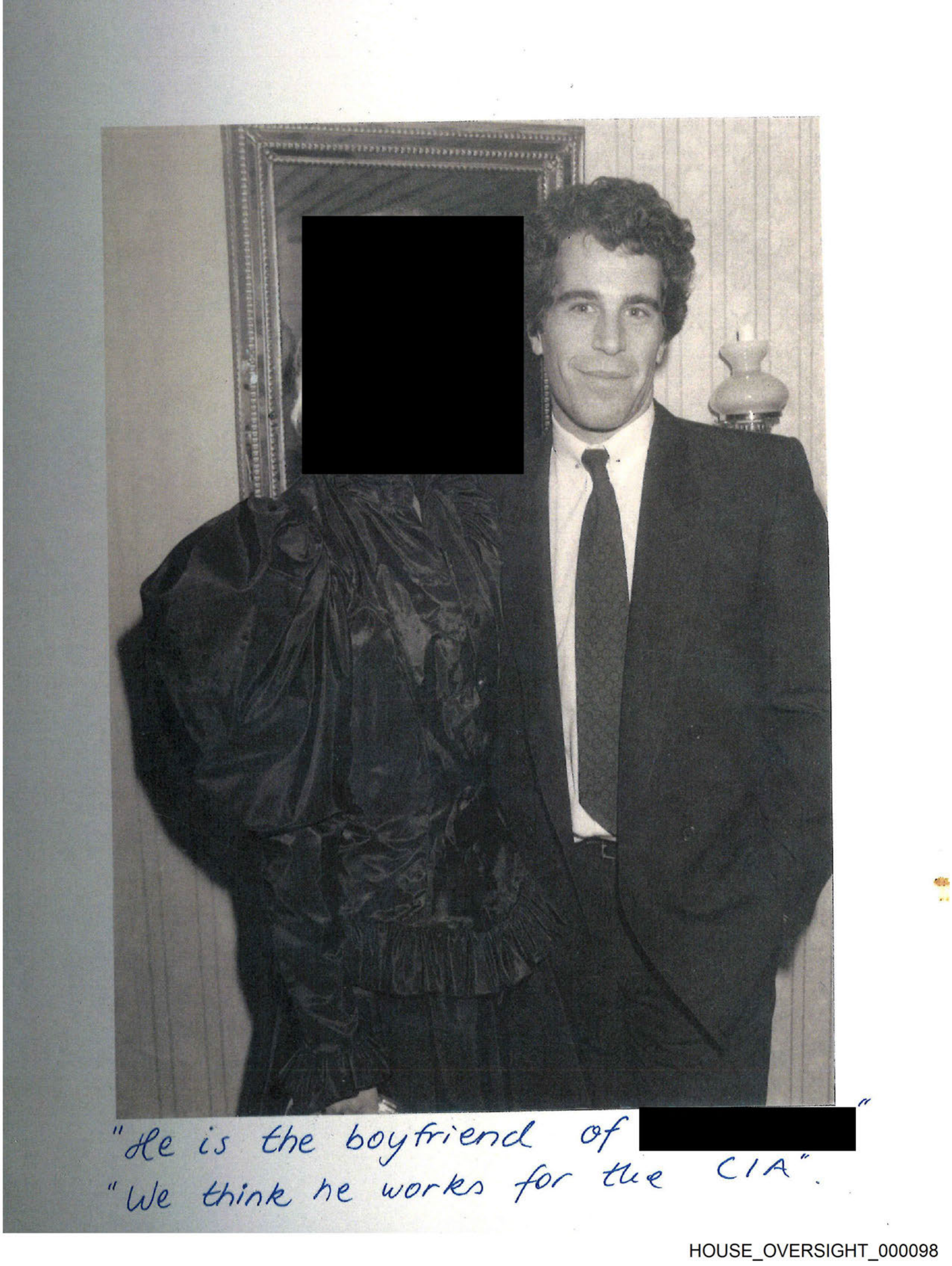 The image appears to be a photo of two individuals with one partially obscured by what looks like a digital blur. The person not obscured is wearing a dark suit and tie; they seem to have short hair and are smiling at the camera. In the background, there's a room with an ornate door and wall decoration. There's visible text on the image that reads "He is the boyfriend of we thought he worked for the CIA" which suggests a personal connection between the person in the photo and someone who might have had assumptions about their profession. The setting appears to be a formal or semi-formal indoor space.