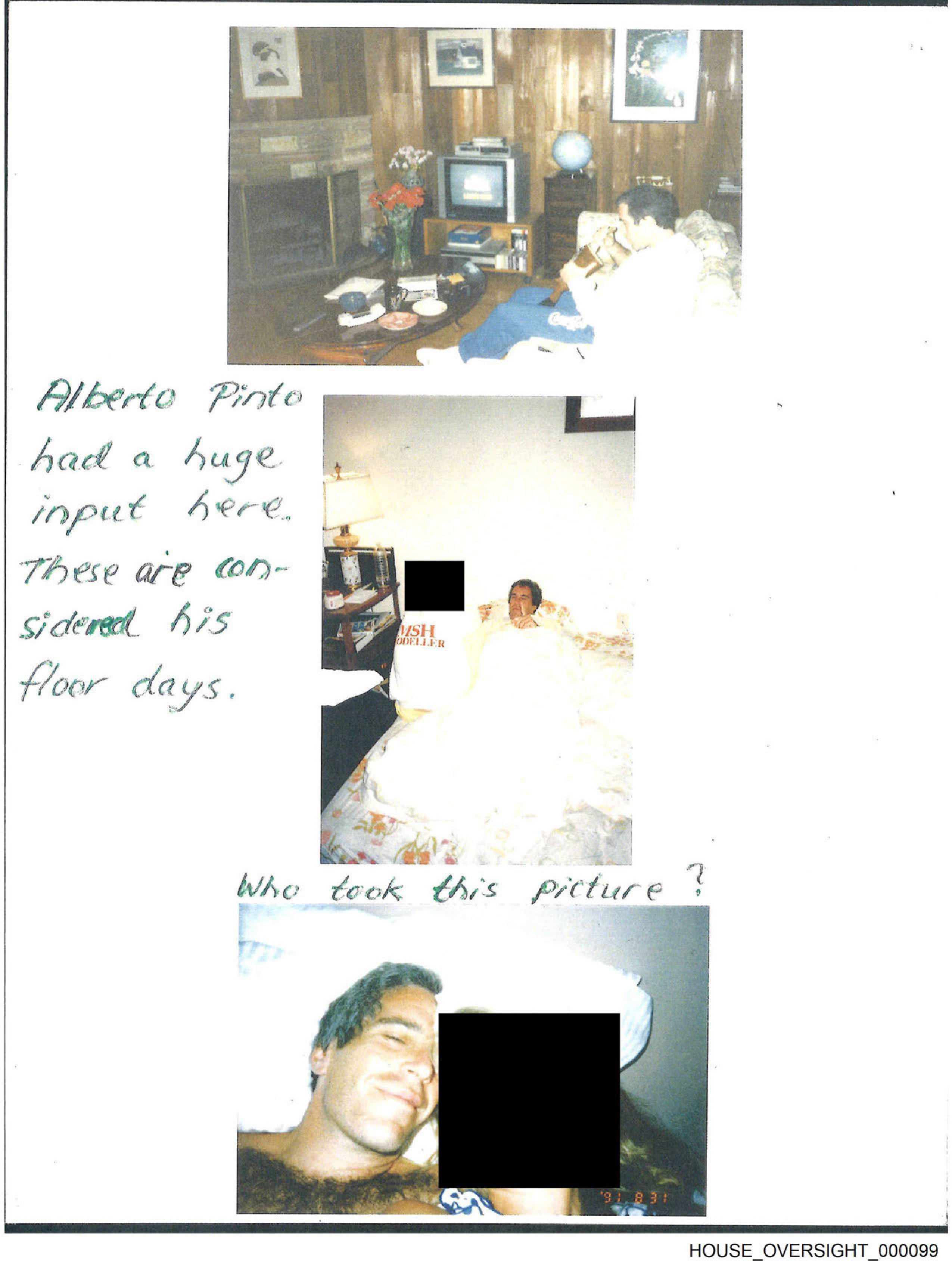 The image shows a collage of three photographs with handwritten annotations on top. The first photograph appears to be an interior room scene with wood paneling and a TV set in the background. There's a large bed occupying much of the space, and someone is sitting in front of it, partially visible but their face is obscured by a red scribble, possibly indicating they are not meant to be identified. The second photograph seems to be an outdoor setting with natural lighting, showing the back of a person who is looking at something off-camera. There's also a blurred figure in front of them wearing what appears to be an astronaut suit or space suit, suggesting this might be a themed attraction or display. In the third photograph, there's a close-up of two people lying in a bed with white sheets and pillows. One person is facing away from the camera, smiling at something out of frame. The other individual is only partially visible on the side; their face is obscured by a red scribble as well. The handwritten text says "Alberto Pardo had a huge impotence" for the first photo and "here they are an astronaut" for the second photo, while the third one mentions "who knows this fact" without further context. The annotations seem to be personal comments or jokes, possibly related to the individuals in the photos.