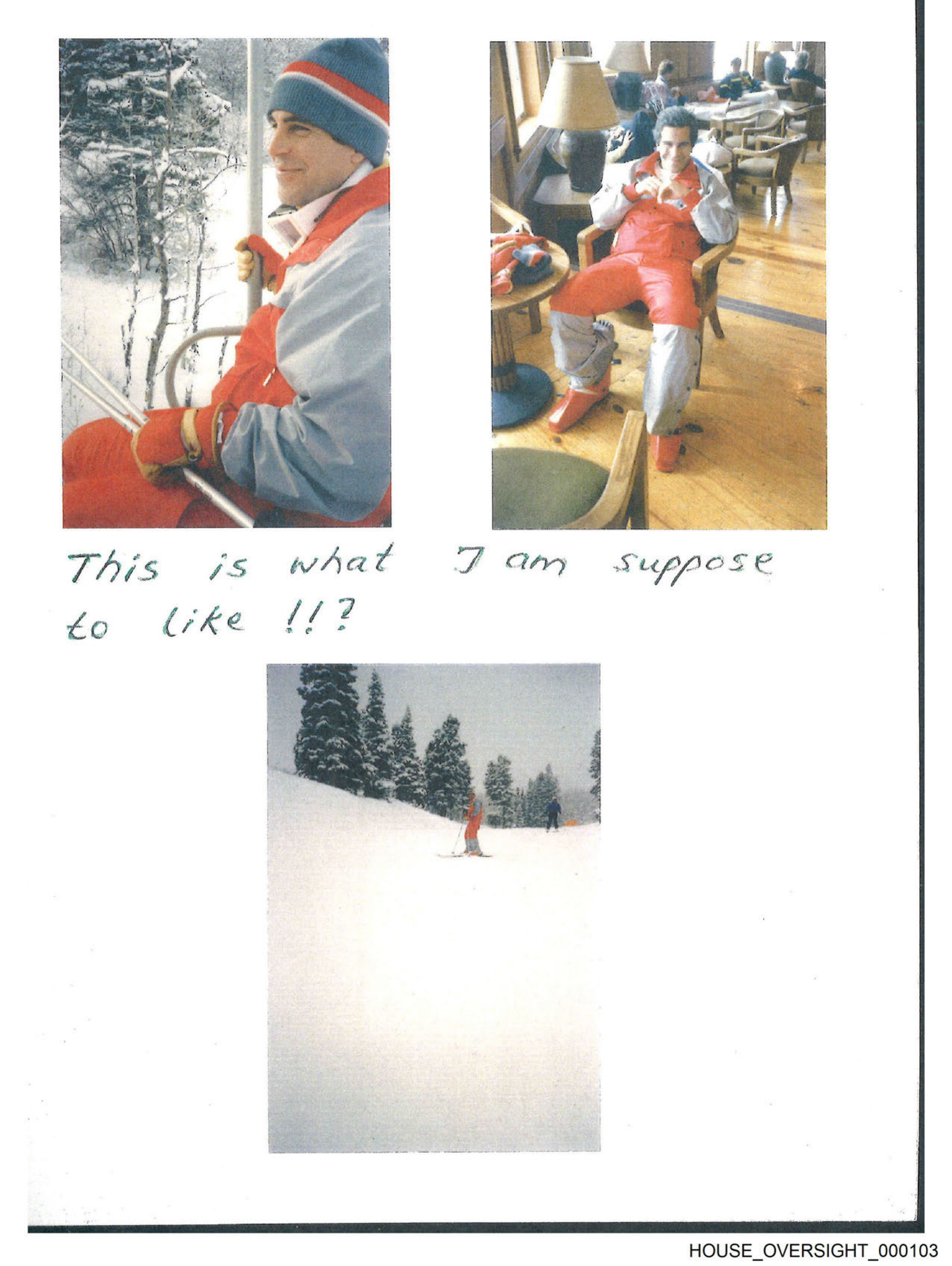 This is a composite of two images placed side by side with handwritten text between them. The text reads "THIS IS WHAT I AM SUPPOSED TO LIKE?" In the top image, there's a man wearing skiing gear and a beanie, smiling as he sits in what appears to be a ski lift or a similar type of chairlift. He is holding onto a safety bar. The background shows snowy slopes with pine trees, suggesting this might be taken at a ski resort during winter. In the bottom image, there's another man seated on a bench, wearing a red jacket and hat, with skis placed in front of him. A wooden structure that could be part of a ski lodge can be seen behind him, further indicating a winter sports setting.