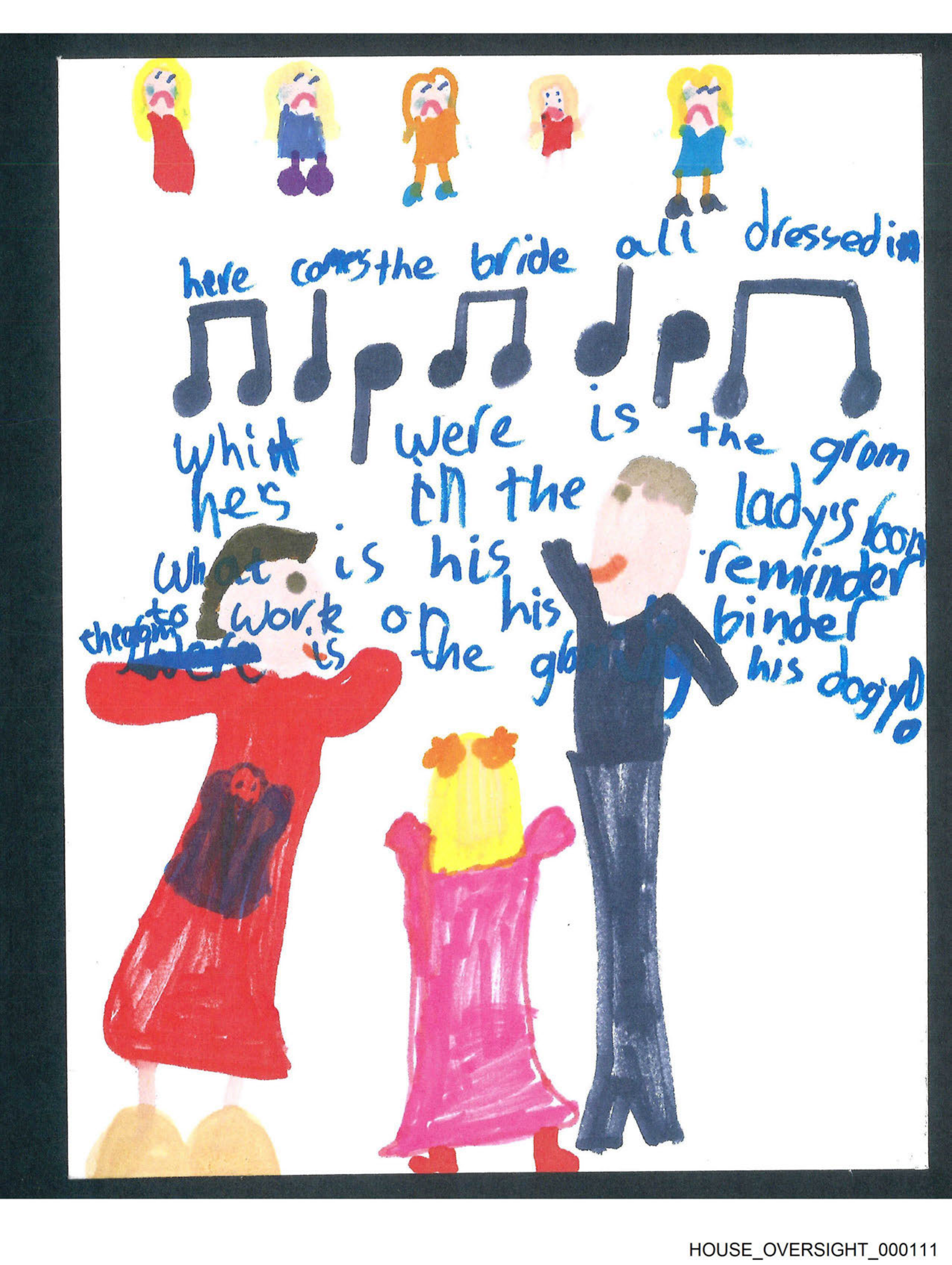 The image appears to be a child's drawing depicting a musical scene. At the center, there are two figures dressed in what seem to be ball gowns and tuxedos, suggesting they might be performers singing at microphones. Around them, several other people are drawn with expressions of joy or surprise, indicating that they are part of an audience enjoying the performance. The background is minimalistic, primarily consisting of a few lines and shading, which do not represent any identifiable locations. There is text written above the figures at the center; however, due to the child's handwriting style, it is difficult to decipher the exact words. Overall, the drawing conveys a sense of enjoyment and community, as if capturing a moment from a live performance or concert.