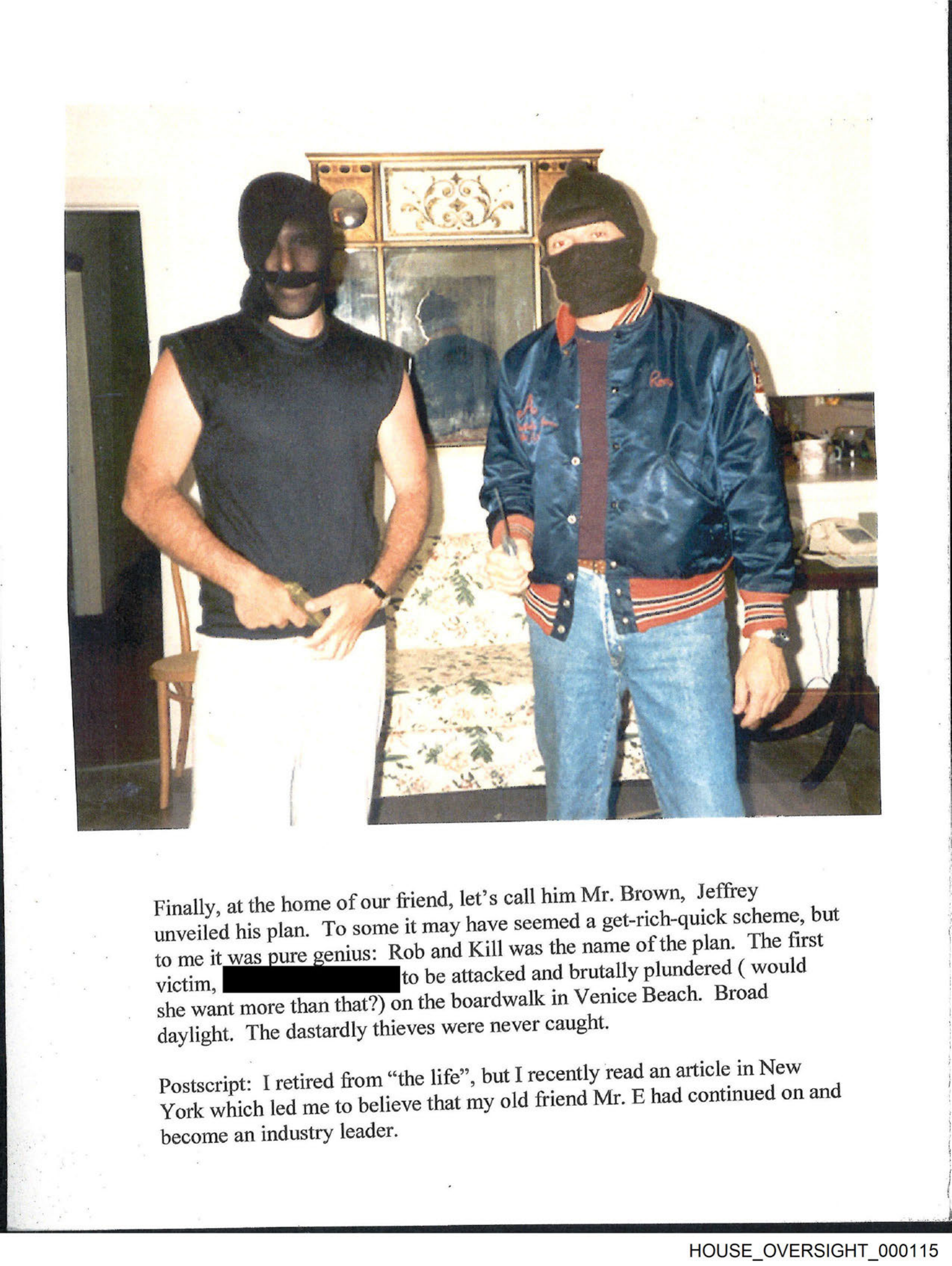 The image is a photograph featuring two individuals standing together. The person on the left appears to be wearing a balaclava that covers their head and neck, with only their eyes visible. This individual also wears a sleeveless top and light-colored pants. To the right of this person stands another individual wearing a jacket with what seems to be a logo or emblem on the back, paired with dark jeans. The setting appears to be indoors, possibly in a living room or similar space, as suggested by the presence of furniture in the background. There is text overlaying the image which is partially obscured; however, it contains phrases like "home" and "attack", indicating that this might be related to a story about violence or crime.