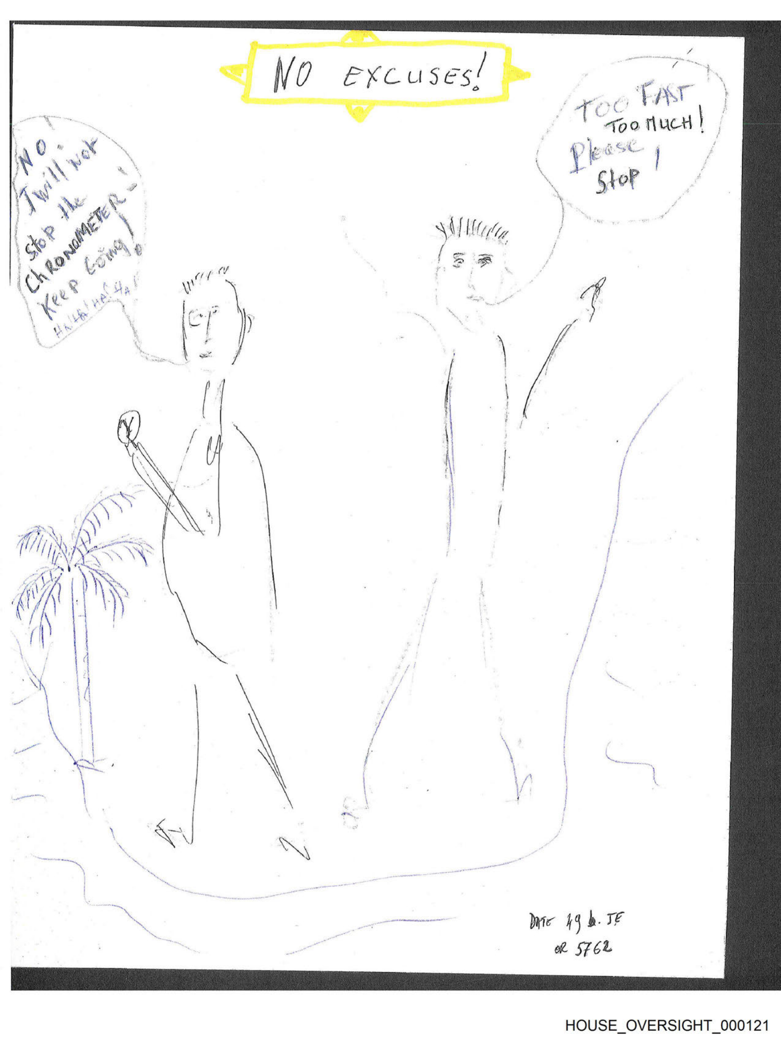 The image appears to be a hand-drawn sketch, possibly made with pen on paper. It depicts two figures standing next to each other. The figure on the left is labeled "Me" and is holding what looks like a book titled "NO EXCUSES!" The figure on the right is labeled "Coach." Both figures seem to be in a conversation or interaction, with the coach pointing towards something out of view. There's also a small palm tree visible behind them, indicating they might be outdoors or in a tropical setting. The overall style of the drawing is simple and informal.