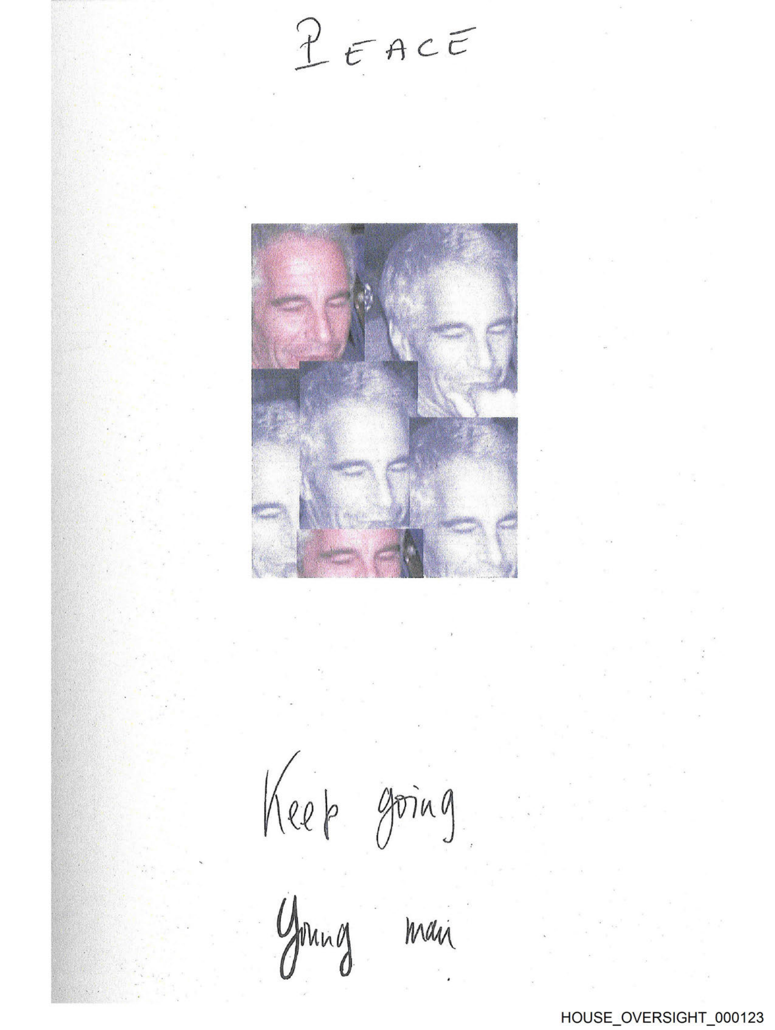 The image shows a page with handwritten text and multiple photographs of a person's face placed over each other. The topmost photograph is partially cut off by the border of the page. Below this collage, there are two lines of handwritten text: "Peace" at the top, and "Keep Going Young Man" at the bottom. The text appears to be a combination of cursive and print styles, with varying thicknesses in the strokes suggesting it was written with different tools or pressure. The photographs feature the same individual with visible facial features, and they overlap each other without any specific arrangement, creating a collage-like effect.