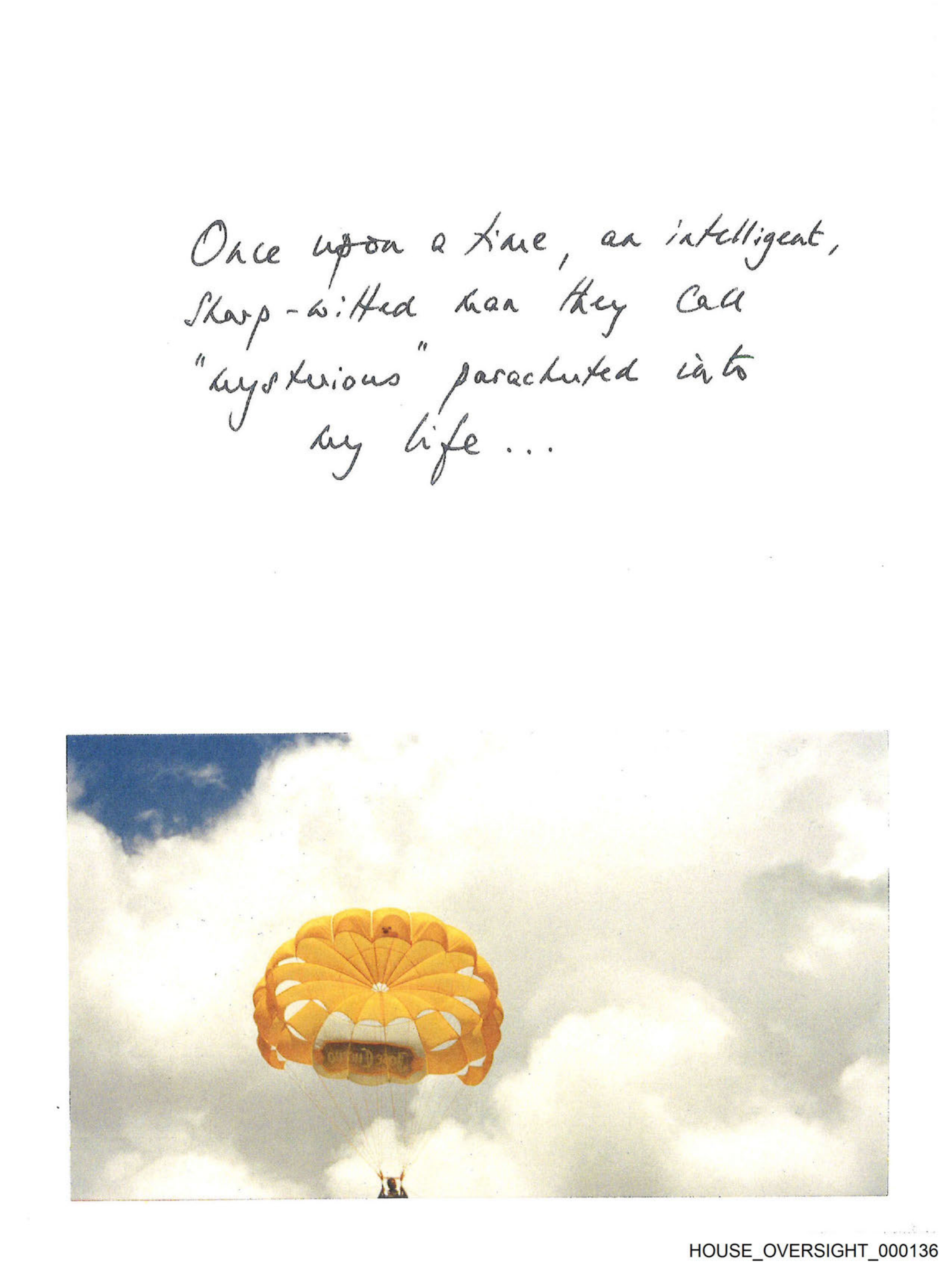 The image is a two-panel composition with both textual and visual content. On the top panel, there's handwritten text that reads: "Once upon a time an 'intelligent' parachutist decided to use his day life". The bottom panel features a photograph of a person in mid-air, wearing a yellow parachute. The parachutist appears to be descending and is surrounded by clouds. The individual seems to be experiencing a clear sky while performing the activity of parachuting.