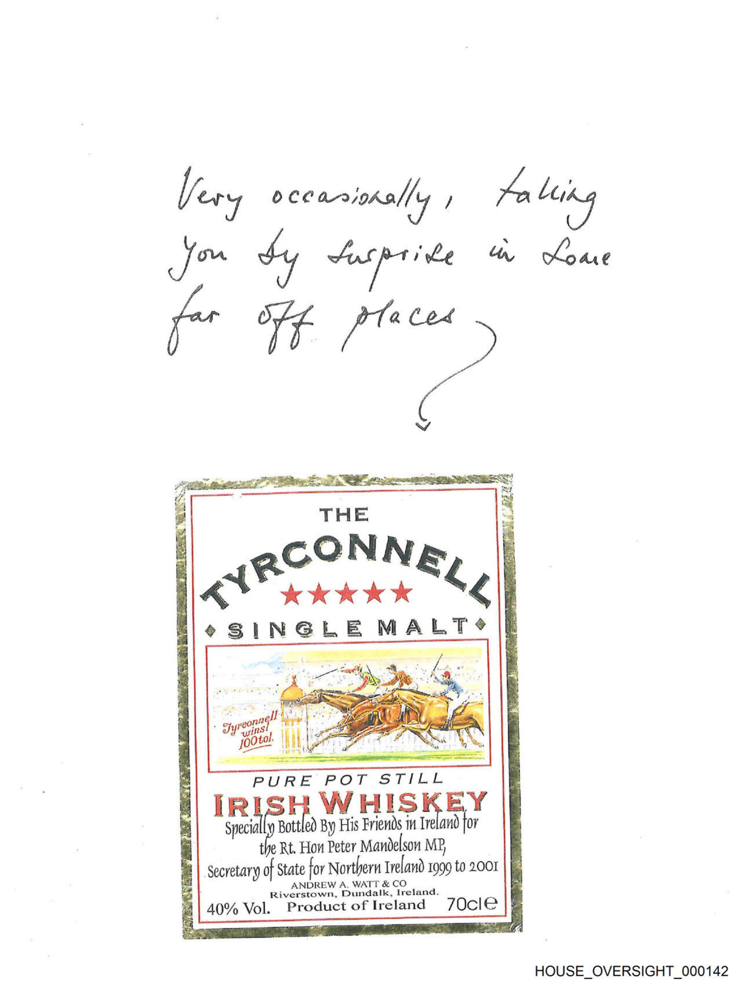 The image shows a handwritten note with the sentence "Very often talking you dry your tears" written on it. Below the note is an illustration of a label for what appears to be a bottle of Irish whiskey named "The Tyrconnel Single Malt." The label has images and text that include the word "Irish Whiskey," suggesting that the image within the handwritten note refers to this type of liquor.
