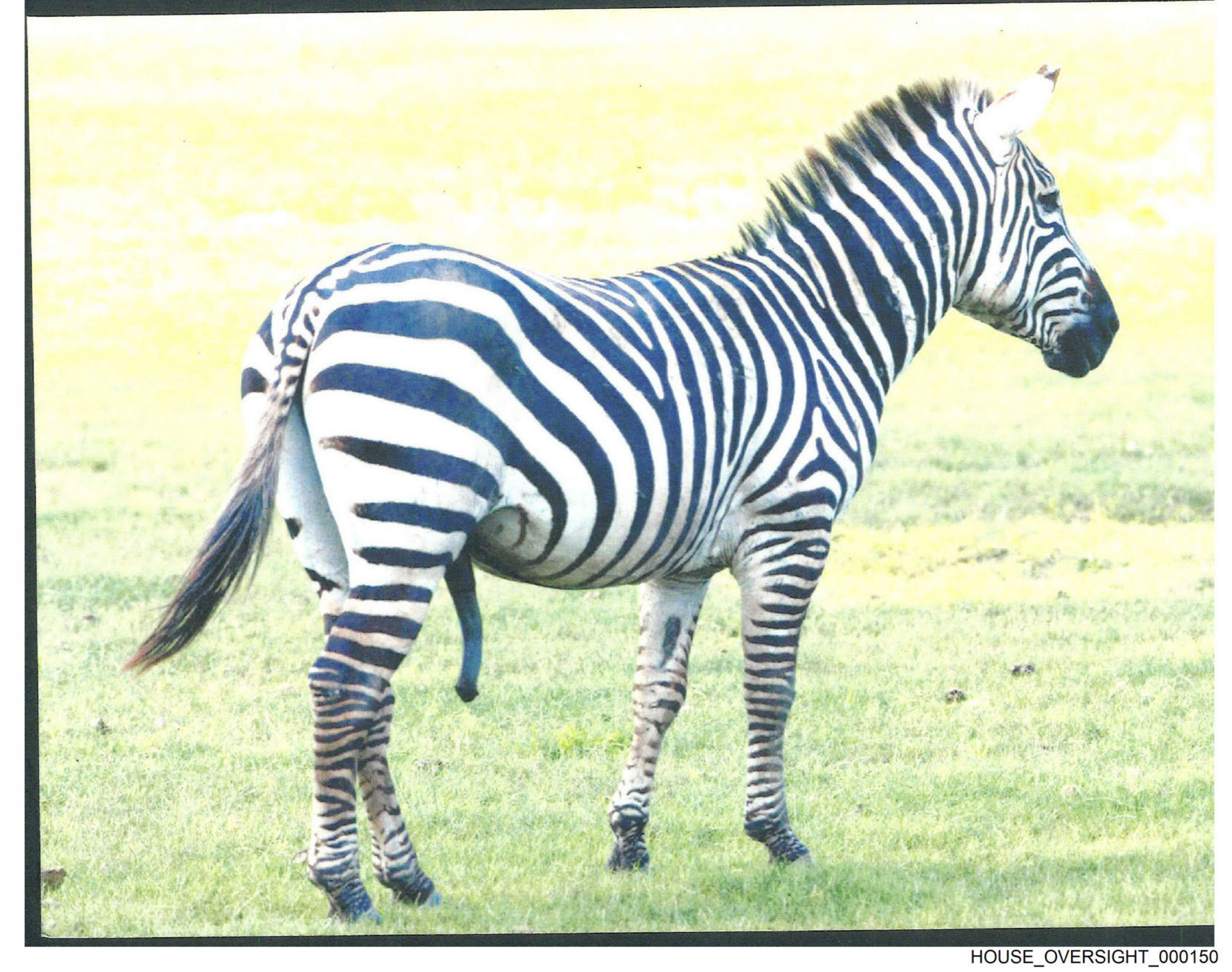 The image depicts a single zebra standing in an outdoor setting with grassy terrain and some trees in the background.