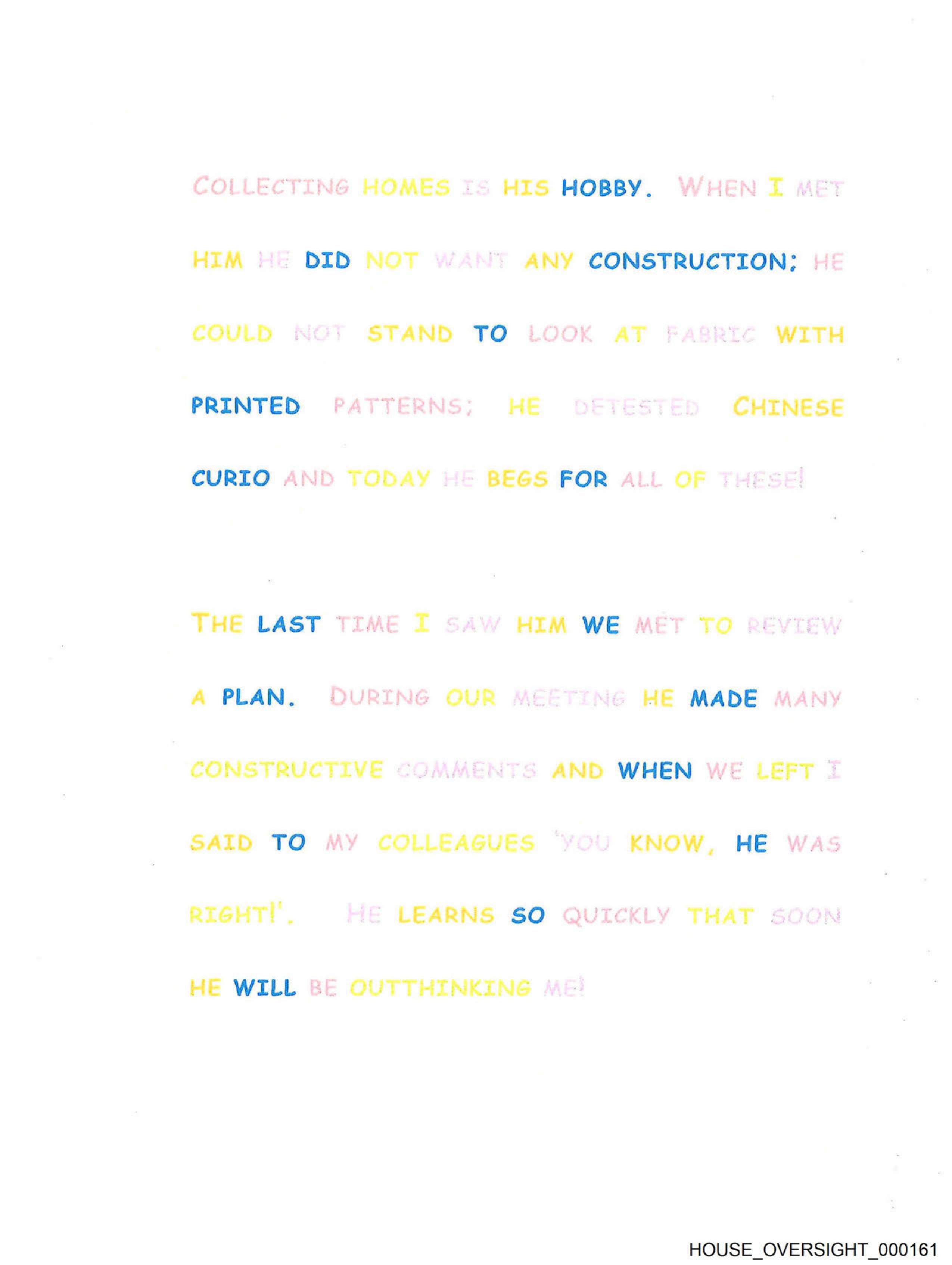 The image shows a piece of paper with handwritten text, which appears to be a note or letter. The text is written in blue ink and includes some corrections made by crossing out words or phrases. There are no visible people or identifiable locations on the paper. The style of the writing suggests it might be from someone who could have been using another language at first and switched to English, as indicated by phrases like "in this hobby" and "he was not sure what he said." Additionally, there's a mention of a visit where the writer commented on the other person being in construction and possibly working with paper models. The text is somewhat jumbled due to the corrections, making it difficult to read the entire content at once.
