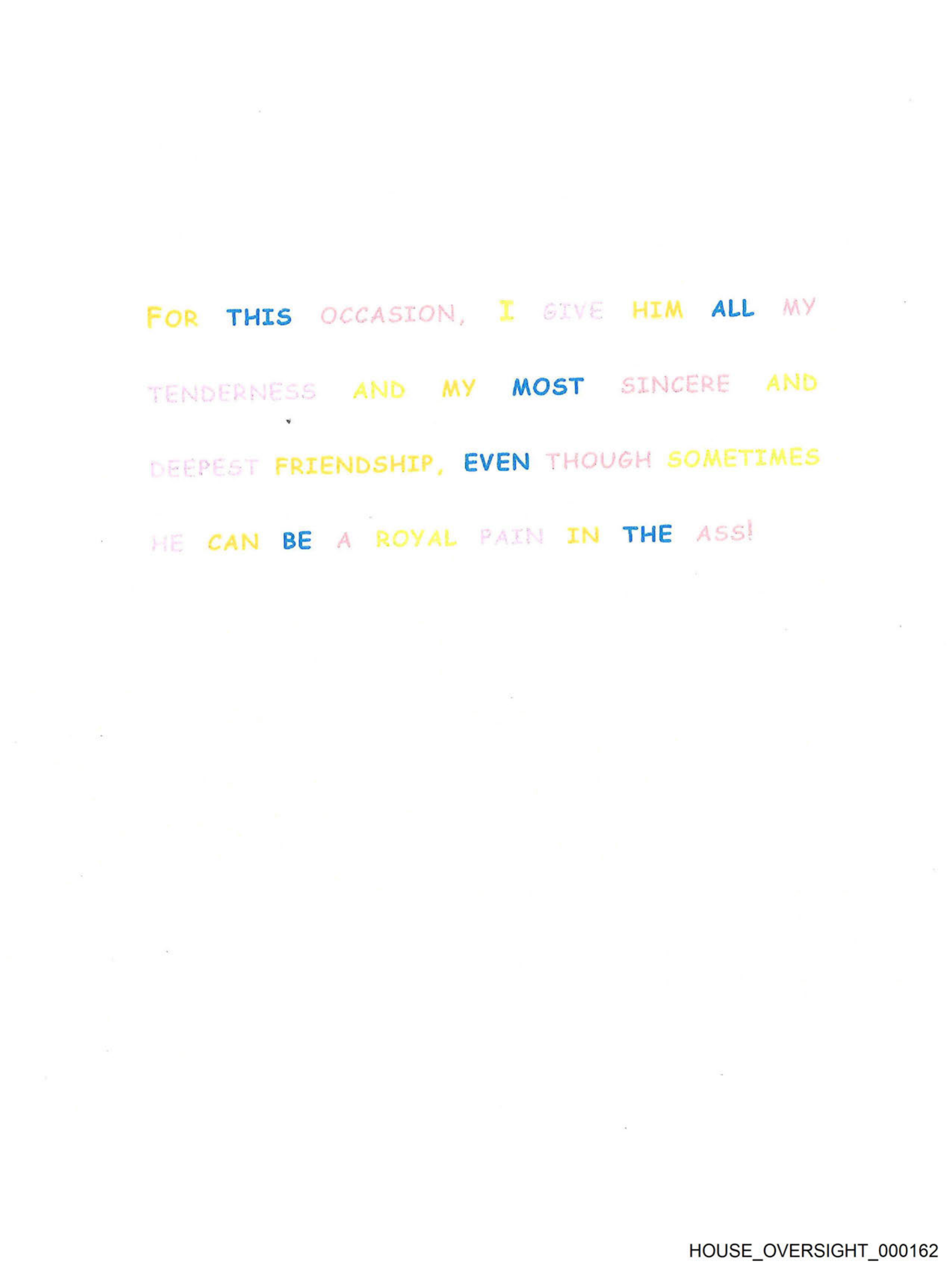 The image appears to be a close-up of a handwritten note with some words cut out, leaving behind an incomplete message that reads "For this occasion I want to thank you for all your tenderness and my most sincere friendship even though sometimes he can be a royal pain in the ass.