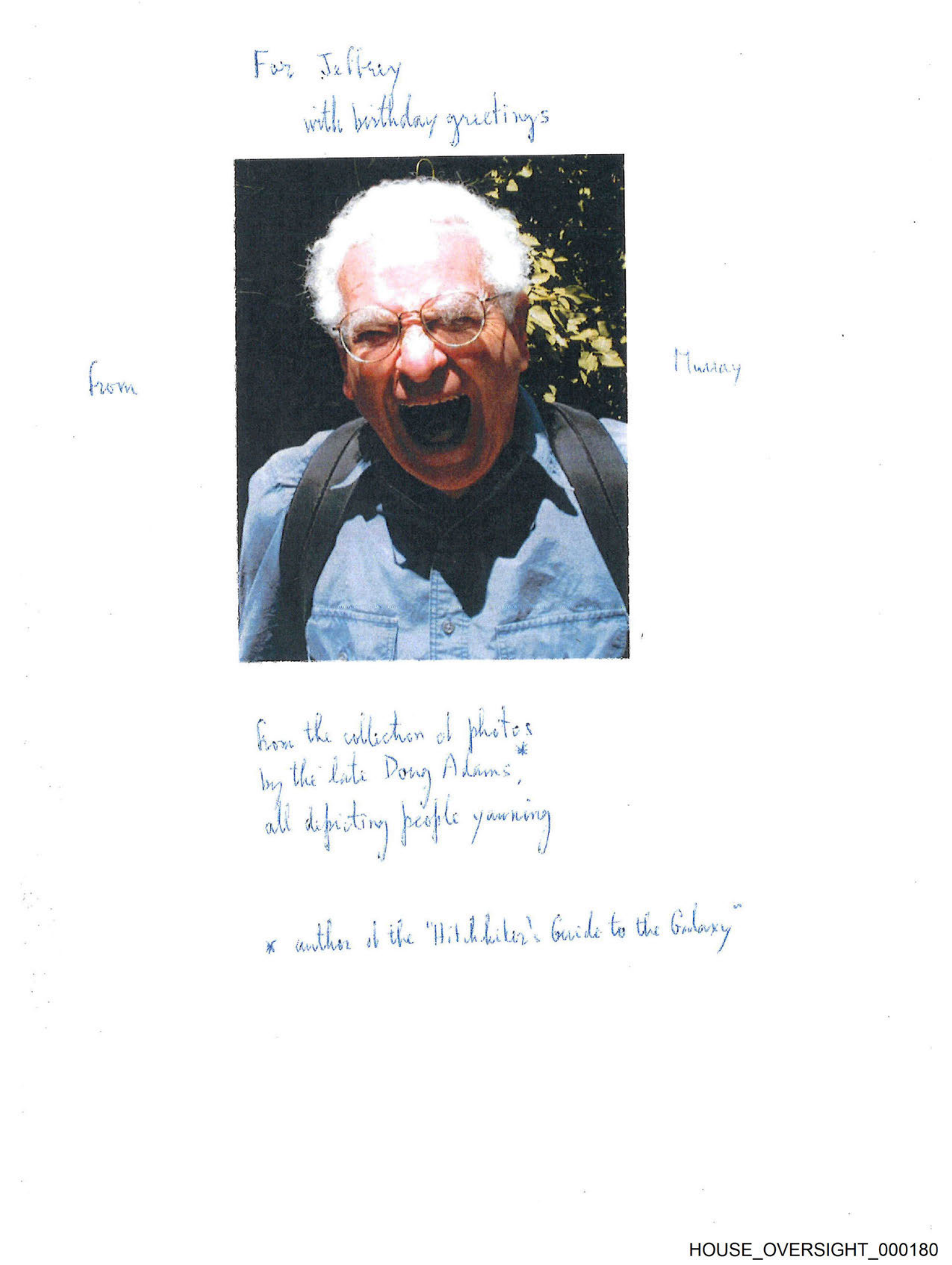 This is a photo of an open document with writing on it and a photograph within the document. The photograph shows a person who appears to be middle-aged or older, wearing glasses and a hat, smiling widely at the camera. The document contains handwritten text in blue ink, but the content is not fully legible from this angle. The overall image conveys a sense of personal correspondence or documentation with a human element, represented by the photograph within the context of the written page.