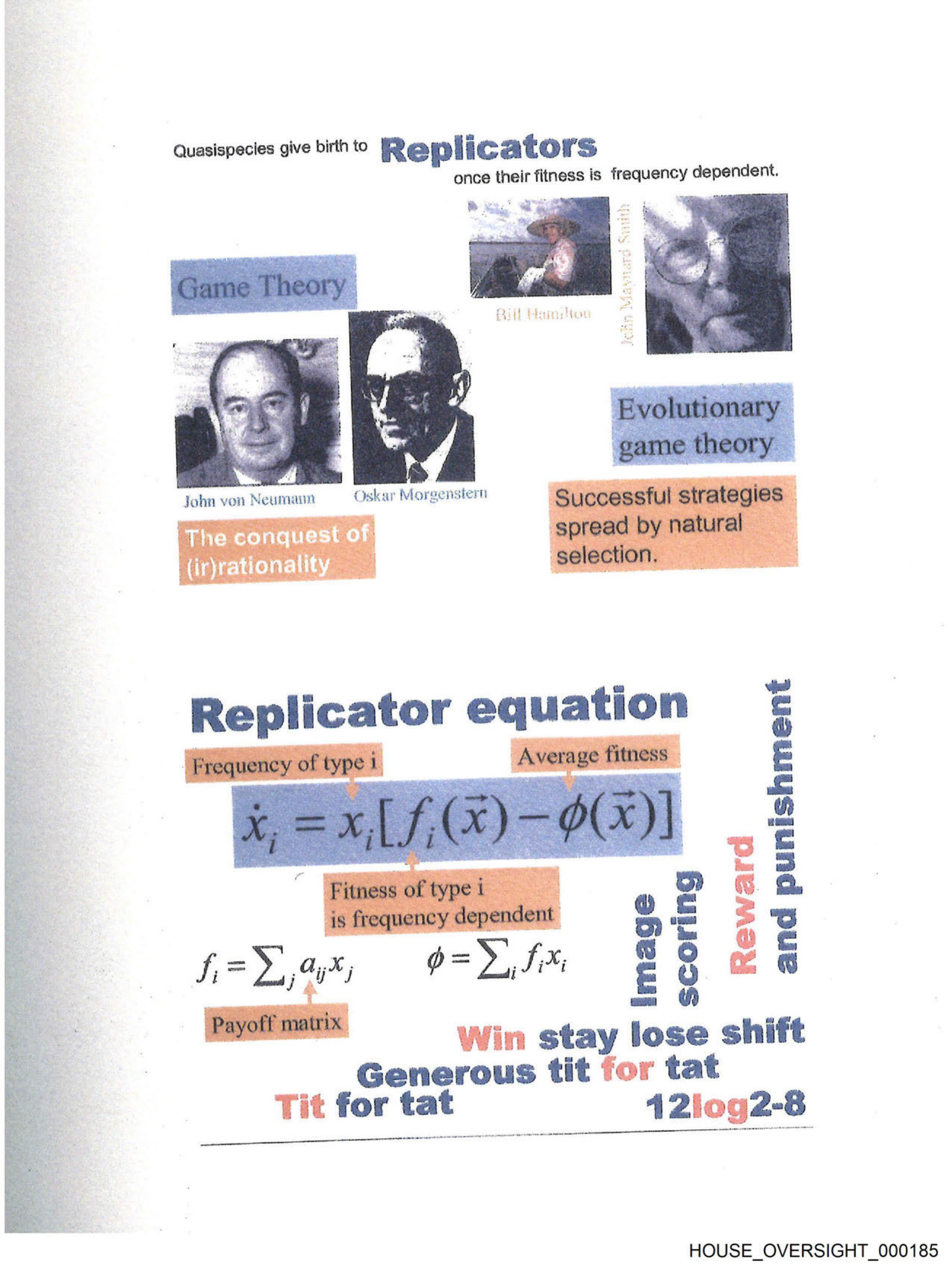 The image is a scanned page from an academic paper or article, focusing on game theory and specifically the Prisoner's Dilemma. There are two main sections of text with headings that read "Game Theory" and "Replicator Equation." The heading "Game Theory" includes a small subheading "The Prisoners Dilemma." In the same section, there is a photograph of John Nash, the mathematician who contributed to game theory. The text surrounding his image discusses the concept of mixed strategies in the context of the Prisoner's Dilemma. Below that, under the heading "Replicator Equation," there is a mathematical equation with variables and terms related to replicators, frequency, fitness, etc. This section also contains a flowchart or diagram explaining how to use the equations to predict outcomes in the game of Rock-Paper-Scissors. The page has a formal layout typical of academic literature, with headings in bold type, subheadings in italic, and the main body text in a standard serif font. The overall tone of the image suggests an educational or scholarly context.