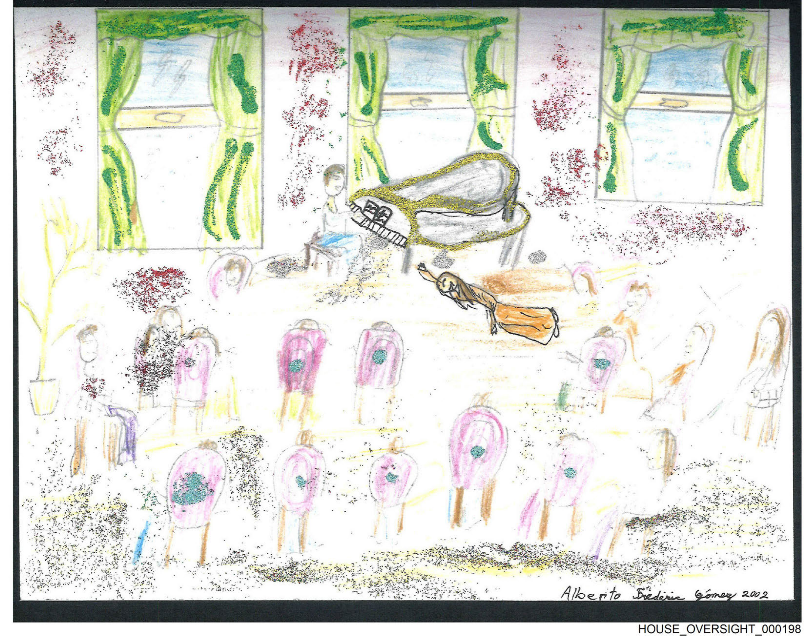 The image is a children's drawing depicting an indoor scene with figures that resemble human beings and furniture. In the foreground, there are four figures labeled as "people"; they appear to be engaged in some activity, possibly related to the presence of musical instruments nearby. On the right side of the image, there's a larger figure labeled as "person," who seems to be more prominent and centrally placed among the other figures. In the background, there are two pieces of furniture resembling windows with curtains, suggesting that this scene is set indoors. The windows have abstract designs within them, possibly representing foliage or decorations. There's a significant amount of scribbling around these elements, which adds to the child-like quality of the drawing. The colors used in the drawing are bright and vibrant, contributing to its playful and imaginative style. The text visible in the image seems to be from a caption or title that reads "SUSAN'S DRAWING," indicating that this artwork was created by someone named Susan. The image also includes a watermark at the bottom left corner with what appears to be a signature followed by the year 2019, suggesting that the drawing might have been done in that year.