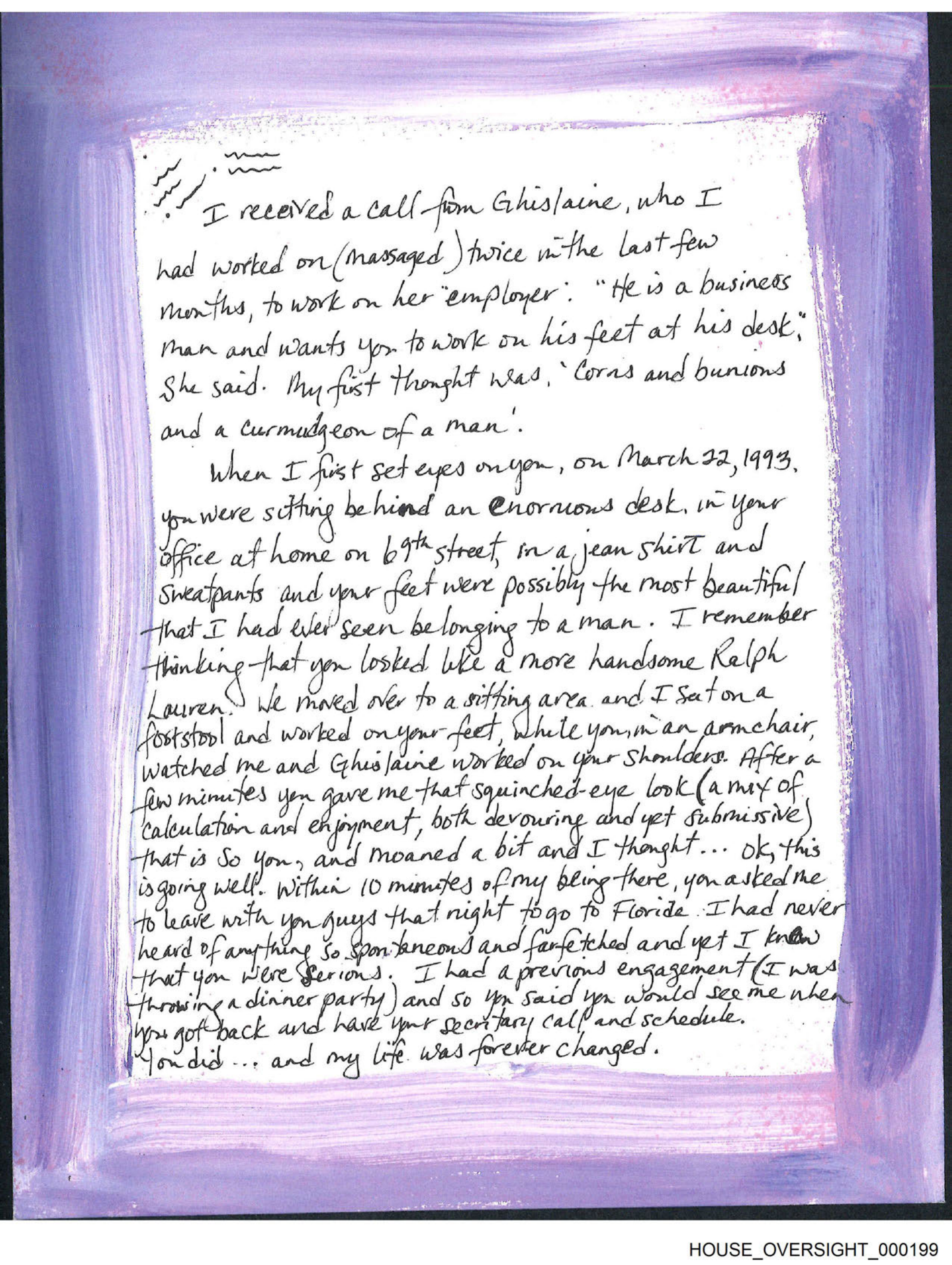 The image displays a handwritten letter on a purple background with lighter purple borders framing the letter.