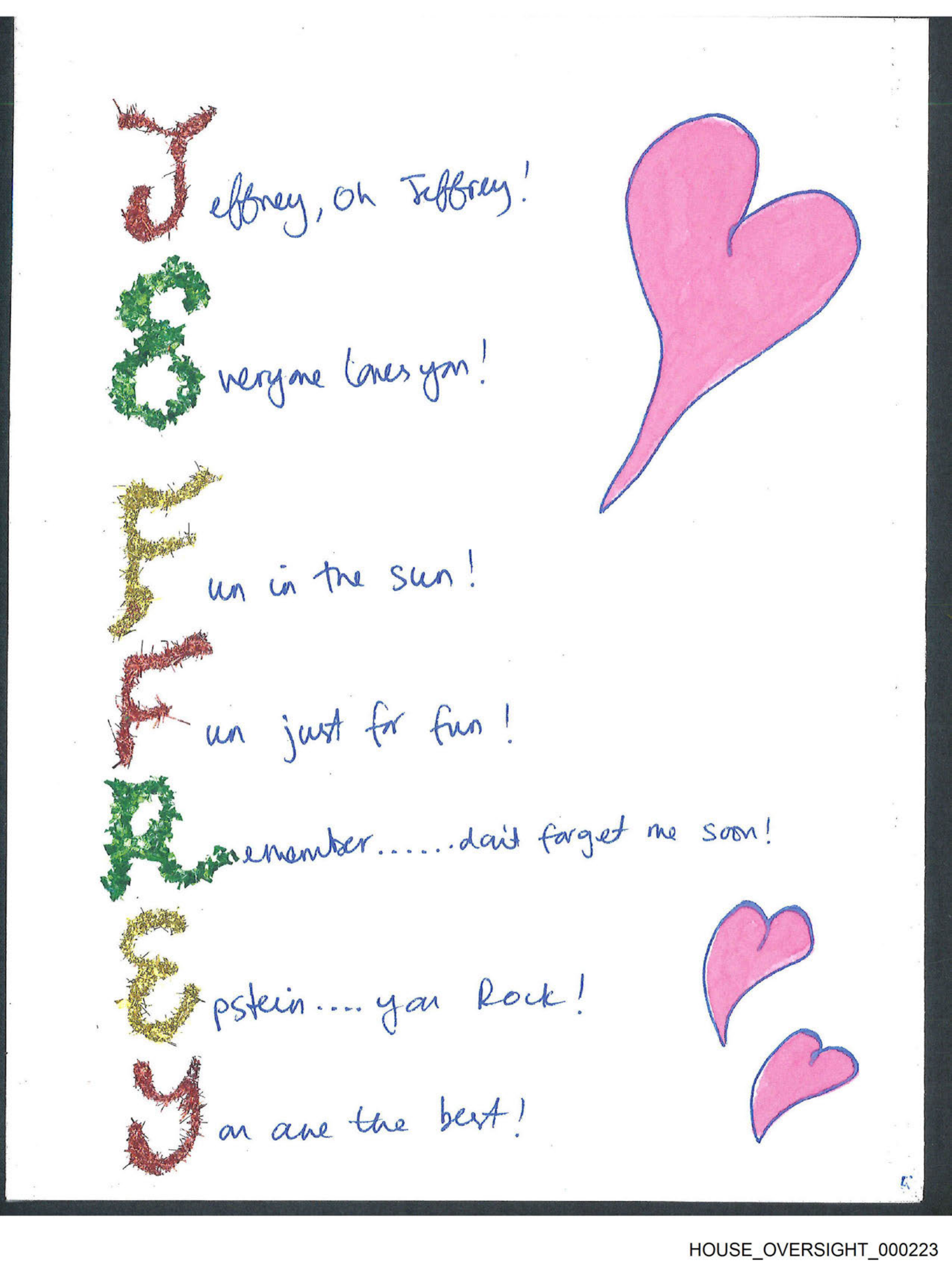 The image presents a handwritten note on lined paper with a cheerful message for someone named Joey. The text is written with a mix of blue and green colors, creating a vibrant contrast against the pink hearts that punctuate the lettering. The writer expresses love and appreciation towards Joey, mentioning several positive attributes like "kind", "funny", and "caring". It appears to be a heartfelt message from one person to another, possibly reflecting the close bond between them.