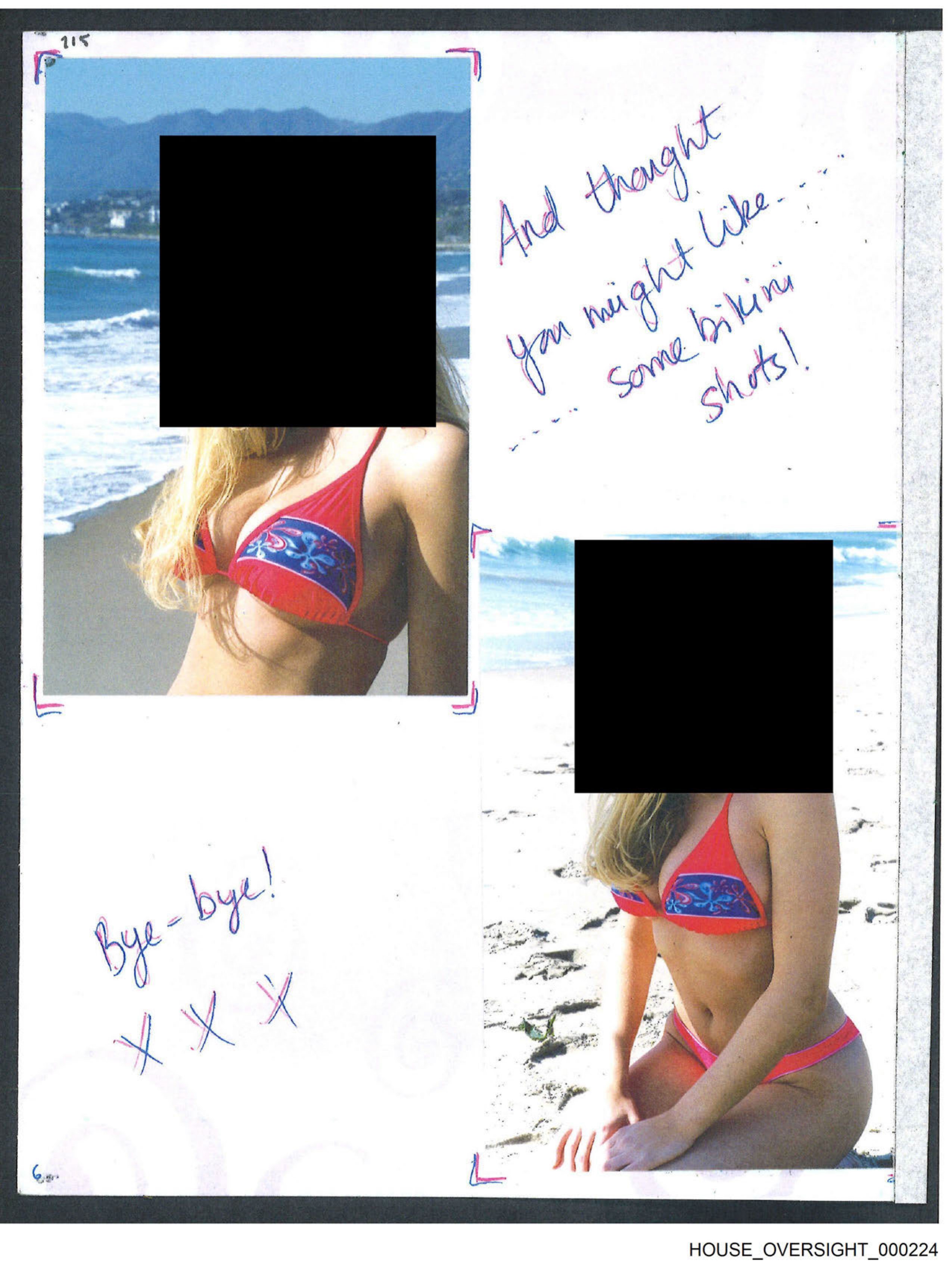This is a collage of three photographs with an overlaid handwritten note. In the top photo, there's a person sitting on a beach near the waterline, facing away from the camera with their back to us and looking out at the ocean. The middle photo features a woman in a red bikini standing on the beach, also facing away and looking towards the sea. The bottom photo shows another woman in a similar pose to the top image but is cropped so that her head is not visible. She is sitting on what appears to be a rock or a ledge by the water's edge. The handwritten note, which seems to be written with black ink and possibly a marker, says: "And I thought we might get some shots!" followed by a red heart symbol. Below that, there's another phrase, "Bye bye!" with two red kisses drawn next to it. The text suggests a casual or friendly tone and could imply a farewell message or the end of a photography session. The image overall appears to be from an informal photographic shoot, possibly taken by someone not professionally trained in photography given the somewhat unprofessional nature of the note and the handwritten style. The setting is likely at a beach or seaside location due to the presence of sand and water in each photo.