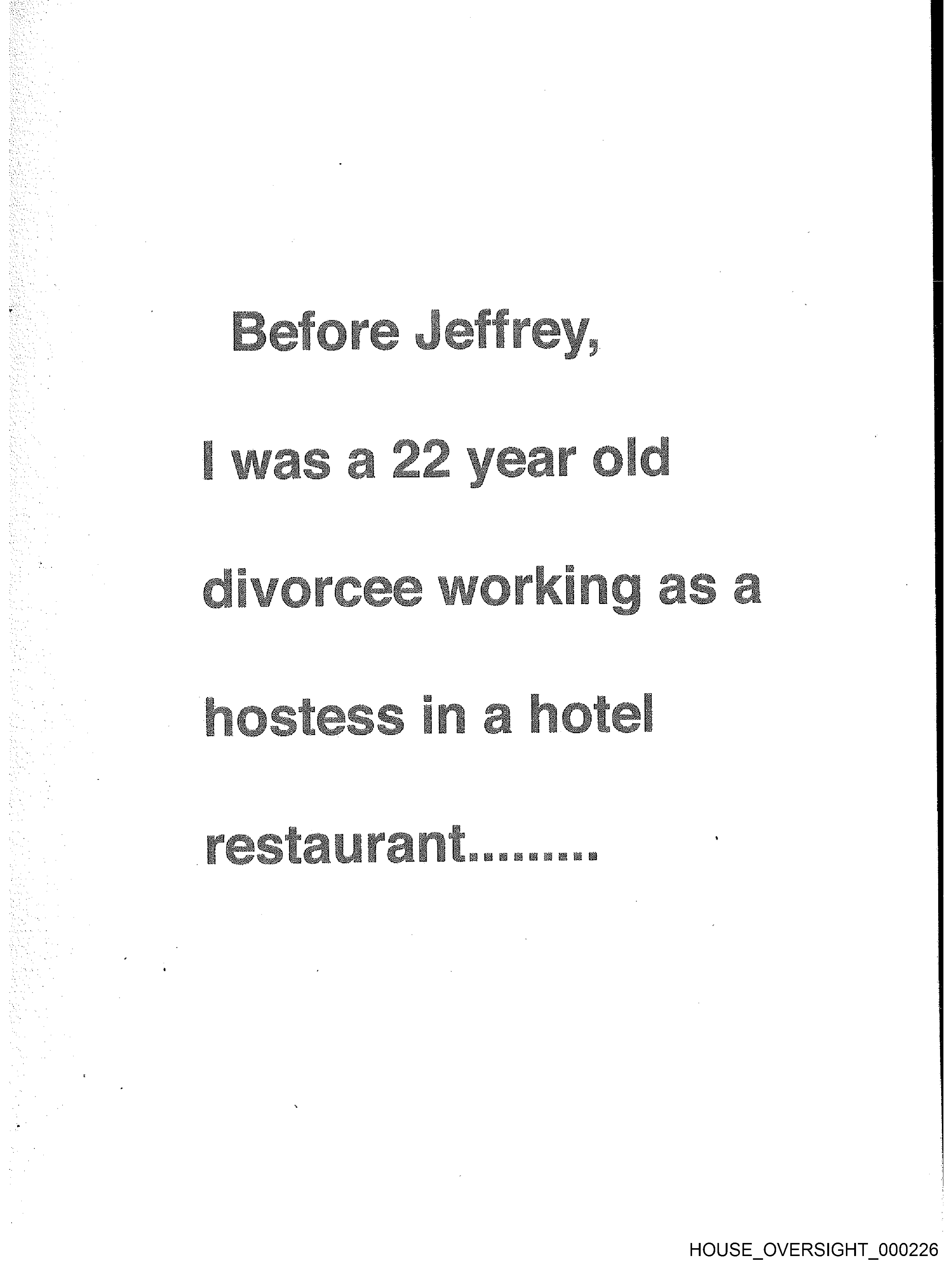 The image appears to be a photograph of a handwritten note or letter. The writing is in black ink on what looks like white paper. There are three lines of text that are legible: "Before Jeff," "I was a 28 year old divorcee working as a hotel maid," and "restaurant hostess." The words are written in different fonts, with varying size and style, which suggests a casual handwriting style. The photo quality is not high, with some blurriness, particularly noticeable around the edges where the colors seem less defined.