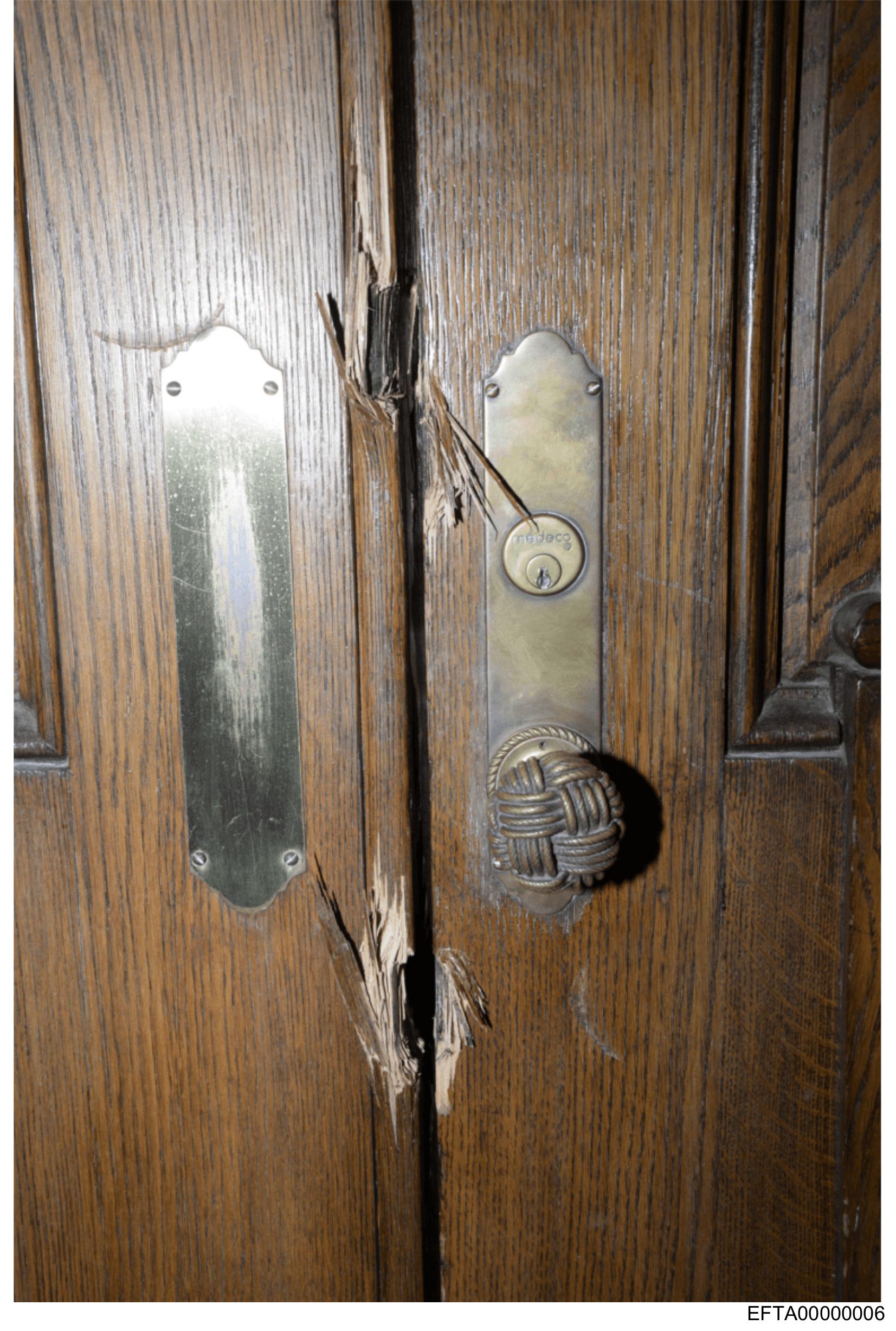 The image shows a damaged wooden door with a metal door handle and key lock on the right side.