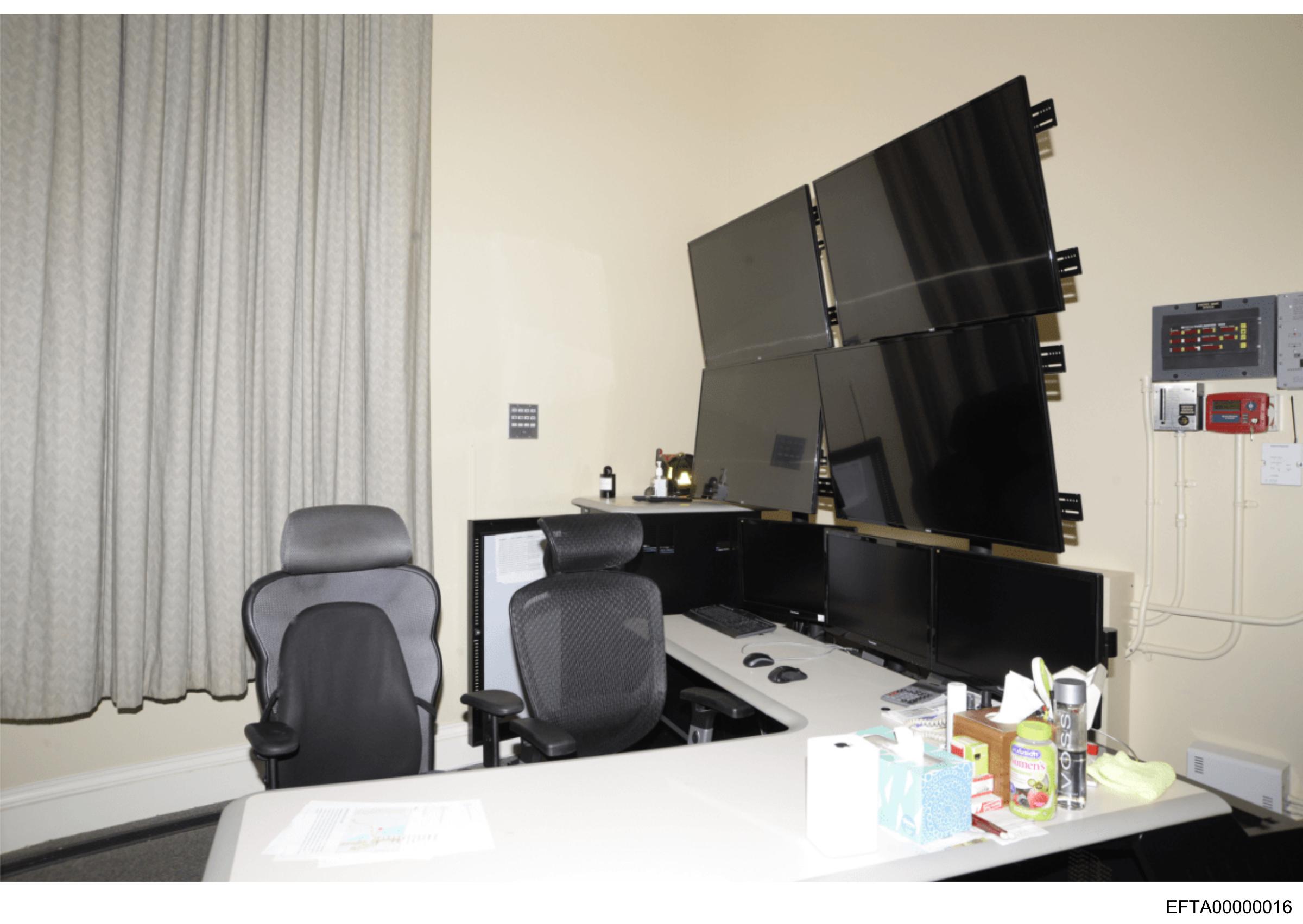 The image shows an office workspace with a focus on a desk equipped with multiple monitors stacked vertically against the wall.