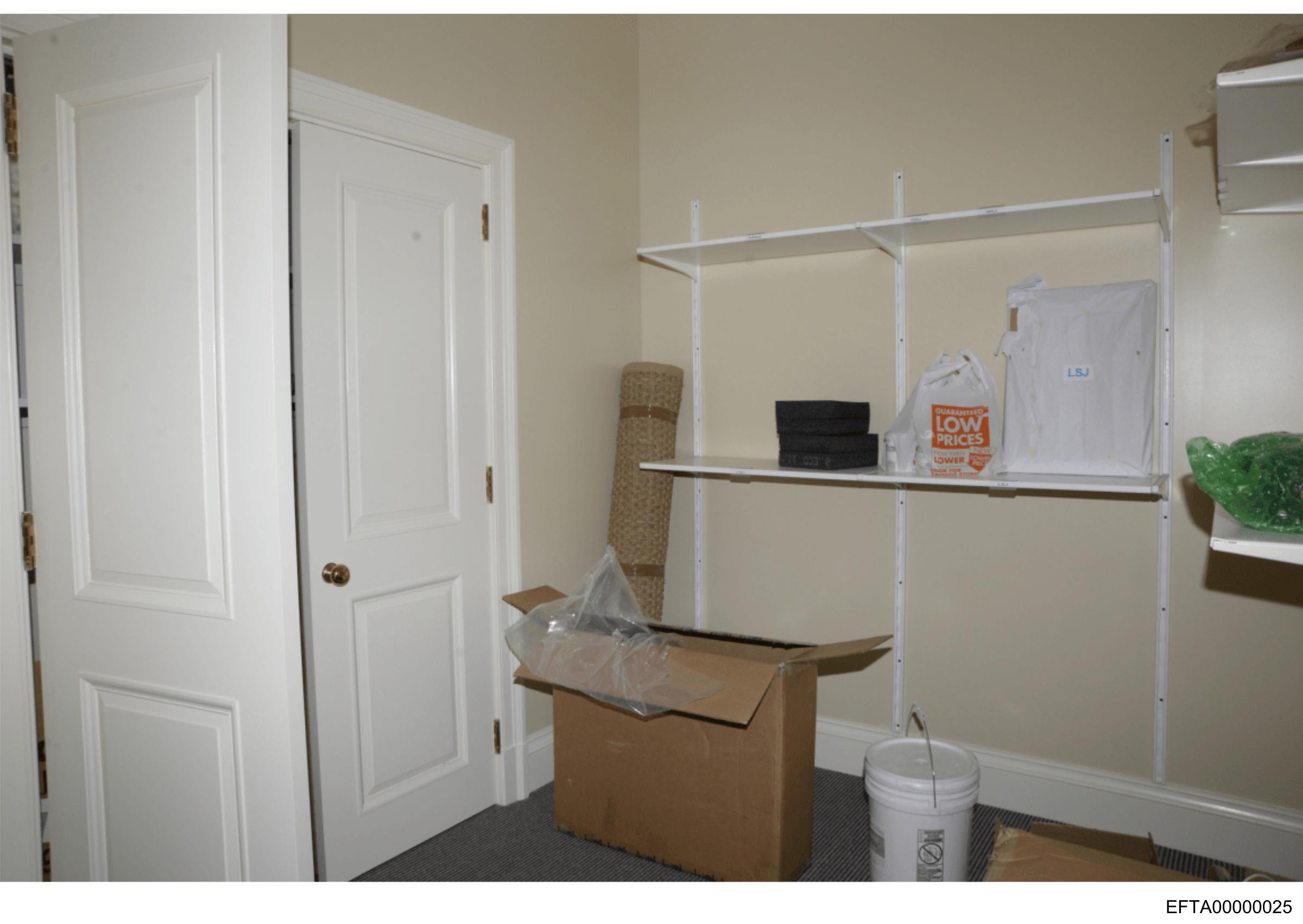 The image shows an interior room with a focus on a white door and some shelving against the wall. On the shelf, there is a clear plastic bag containing what appears to be a shoe or footwear item, and below that is a cardboard box with visible text; however, the resolution of the image does not allow me to read the text clearly. The room has a light-colored carpeted floor, and the lighting in the space seems subdued, suggesting it might be an overcast day or an area with diffused light. There are no people visible in the image.