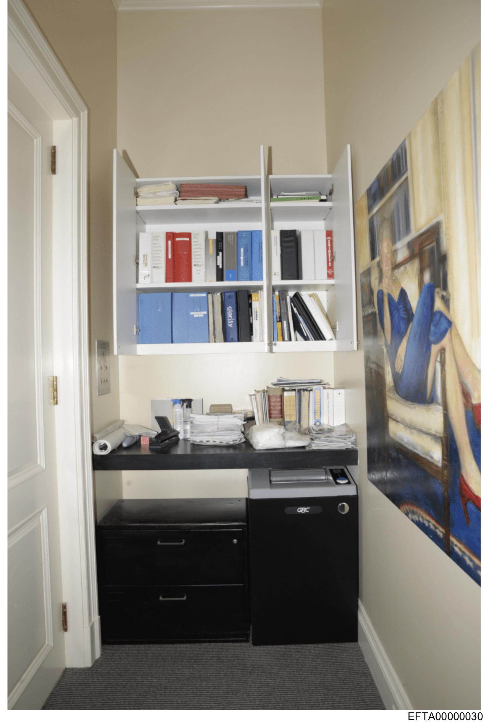 The image captures a corner of an office room. The main focus is on a black desk with a computer monitor on it. A bookshelf is also present next to the desk, filled with various books and binders, suggesting a workspace used for research or study. The wall behind the desk features a framed print, adding a touch of personalization to the professional setting. There are no texts visible in the image. No people are seen in this particular snapshot, indicating a quiet moment in the office space. The location is indoors and appears to be a dedicated workspace within an office environment.