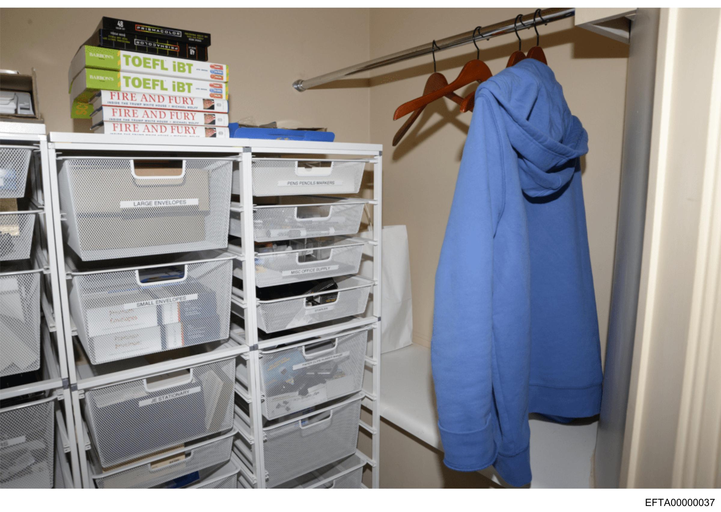The image shows an indoor scene where a pile of storage containers is stacked against a wall. The containers are white and appear to be plastic bins. On top of these bins, there are some items including what looks like books with titles such as "Flying" and "Taking off," suggesting they might be related to aviation or travel. To the right side of the image, there is a blue jacket hanging on a hook from the bottom shelf, indicating that this area may be used for storage and perhaps quick access to items. There are no people visible in the scene. The lighting seems even, and it appears to be an office or storage room with industrial shelving units.