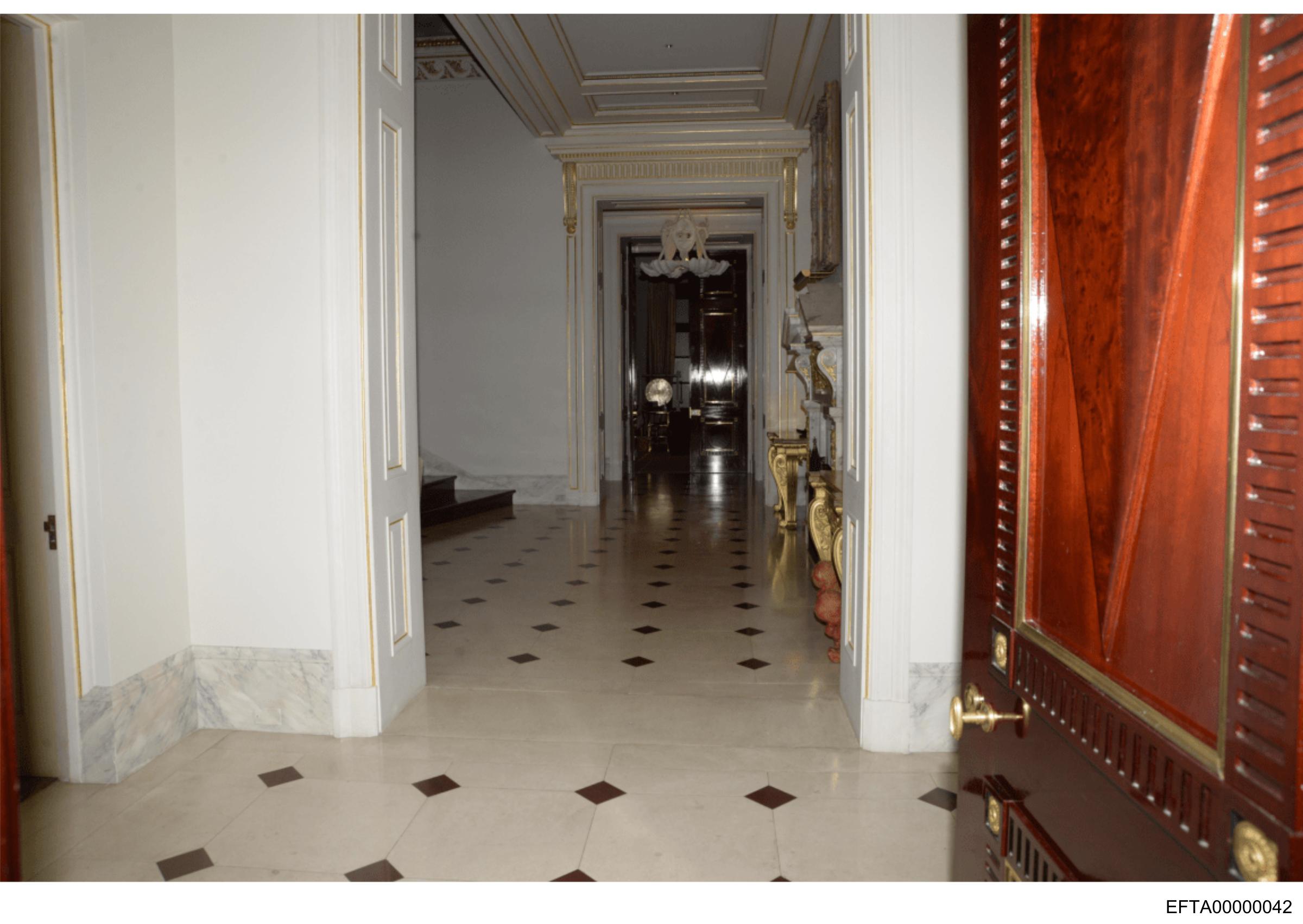 The image shows an interior hallway of a building with classical architectural features. The floor is covered with marble tiles arranged in a pattern that includes dark and light squares. On the right side of the photo, there's a red velvet curtain partially drawn back from a doorway or window, suggesting a room or space beyond that could be a function hall or auditorium due to its grandeur. There are no visible texts, people, or recognizable locations in this image. The style of the architecture and furnishings suggest a formal or ceremonial setting, possibly within a historic building, such as a palace or government institution.
